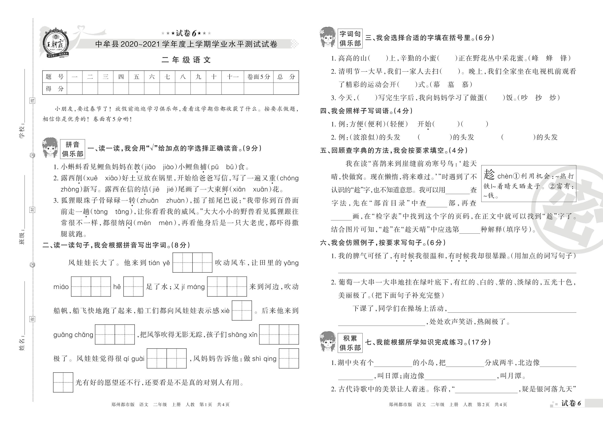 中牟县2020~2021学年度上学期学业水平测试试卷二年级语文(人教版)【6】