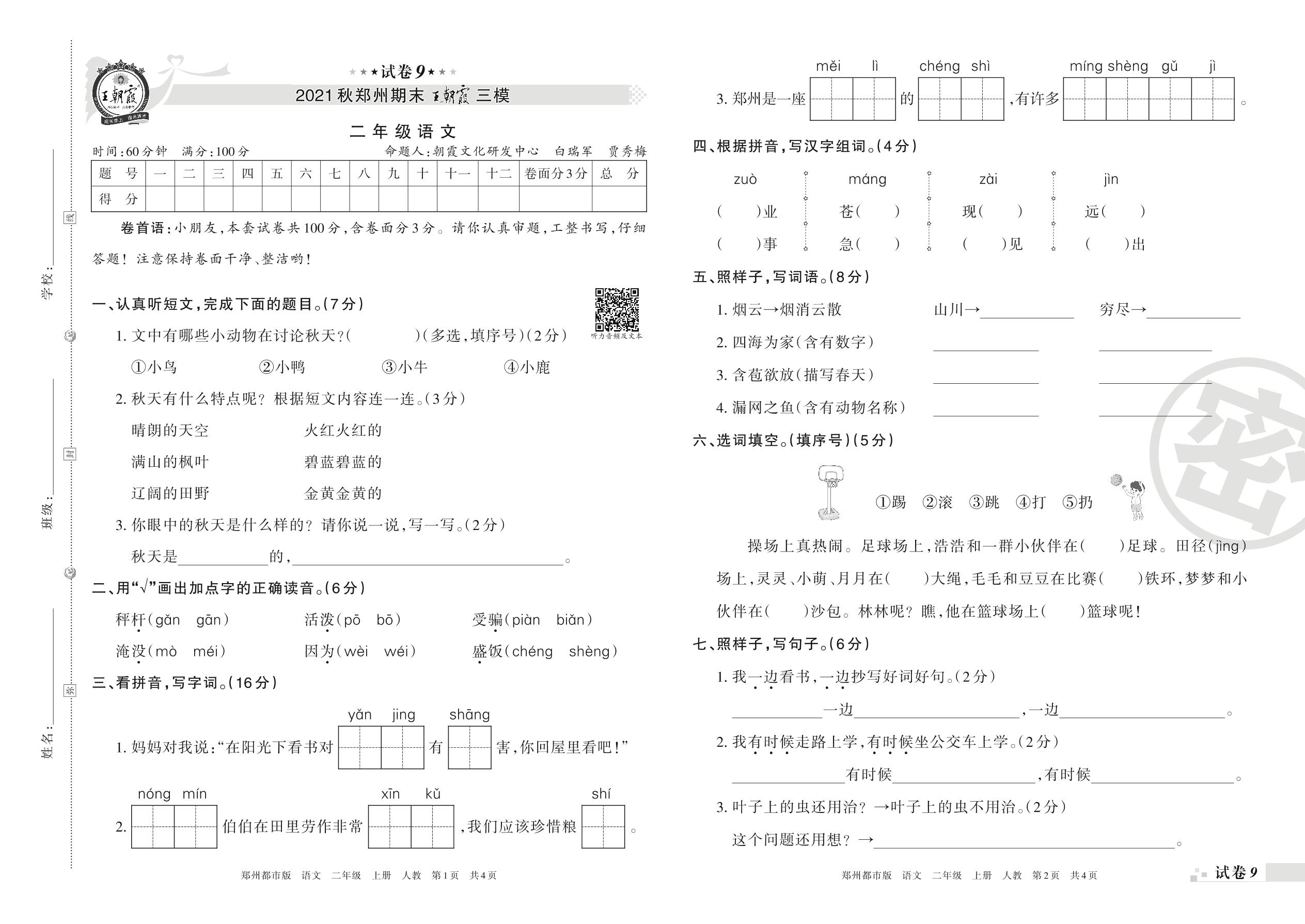王朝霞期末模拟卷二年级上册语文(人教版)_R211223112805352【9】