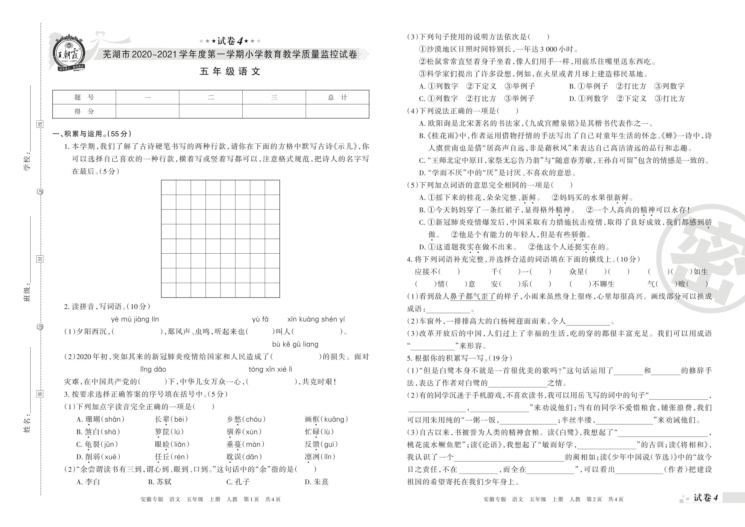 芜湖市2020~2021学年度第一学期小学教育教学质量监控试卷五年级语文(人教版)【4】