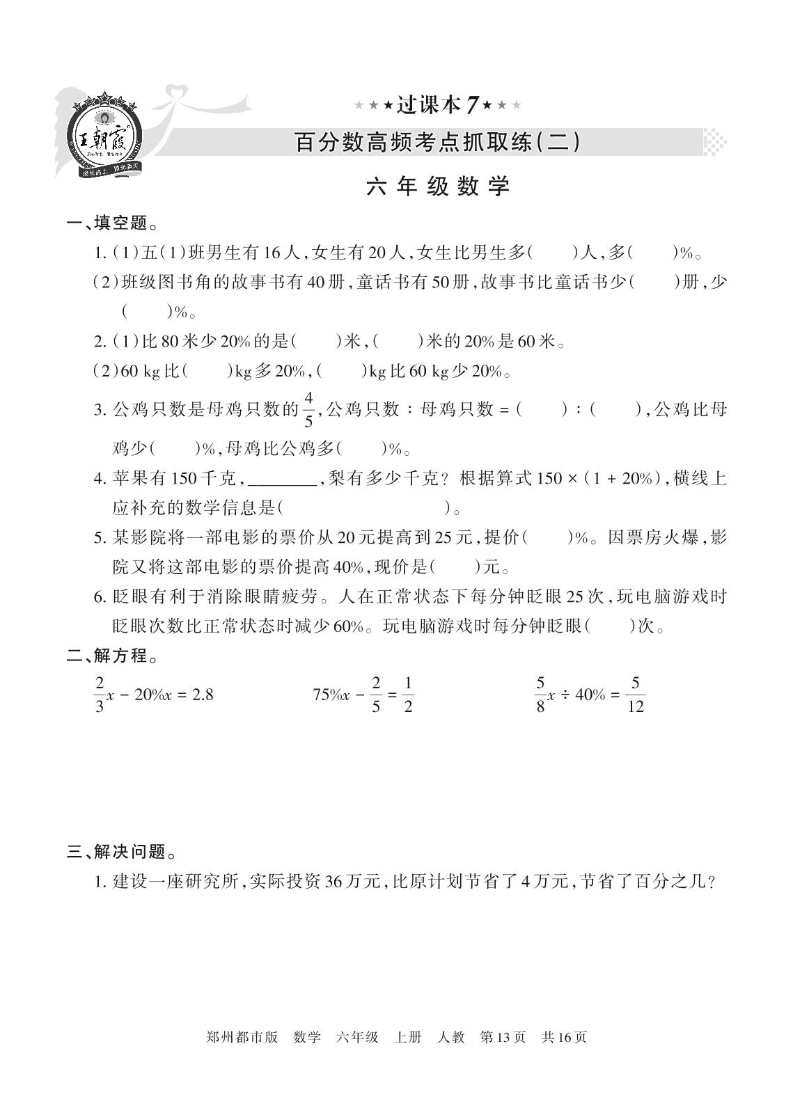 王朝霞期末过课本——百分数高频考点抓取练(二)六年级上册数学(人教版)_R211223113236964【7】