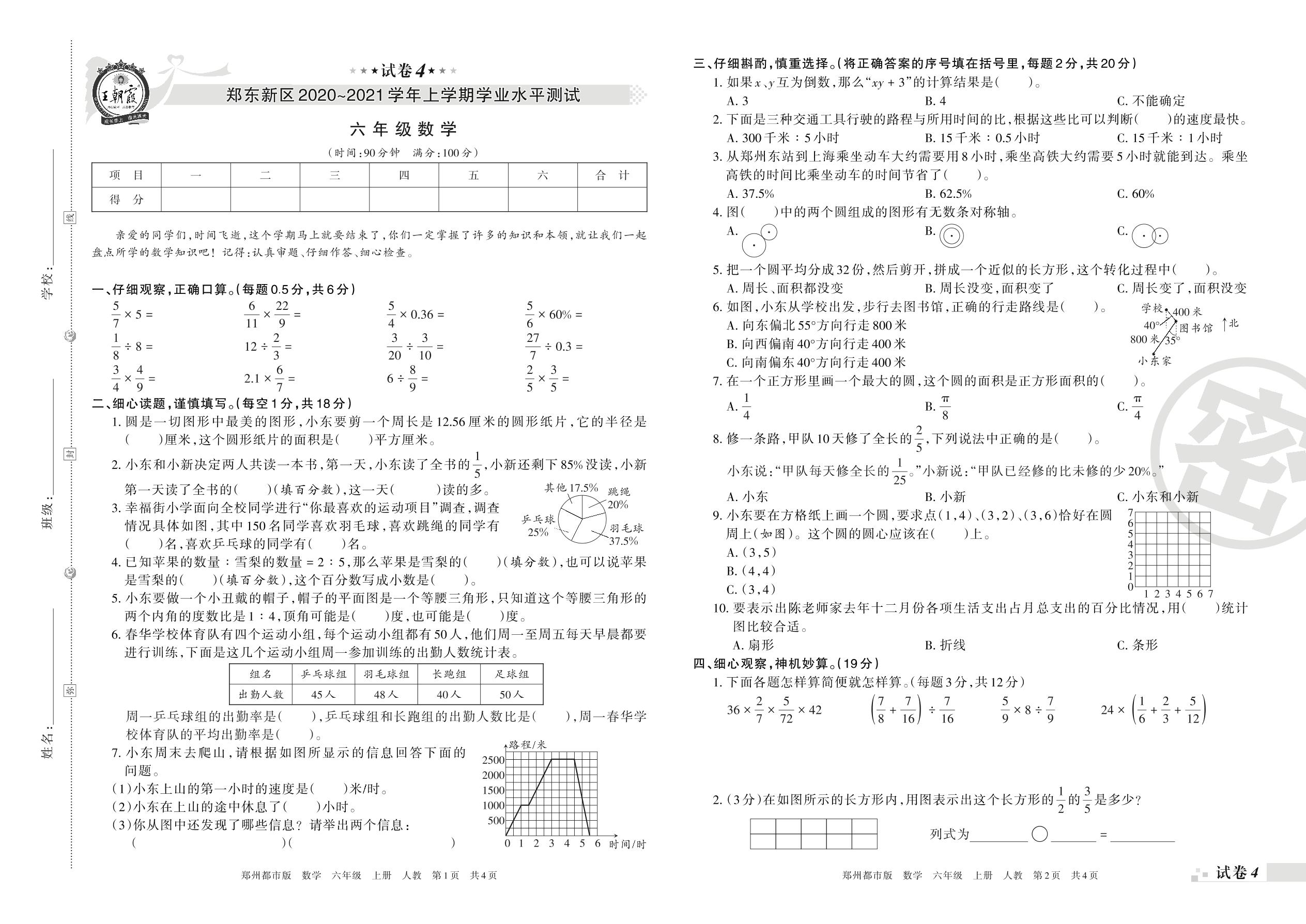 郑东新区2020~2021学年上学期学业水平测试六年级数学(人教版)【4】