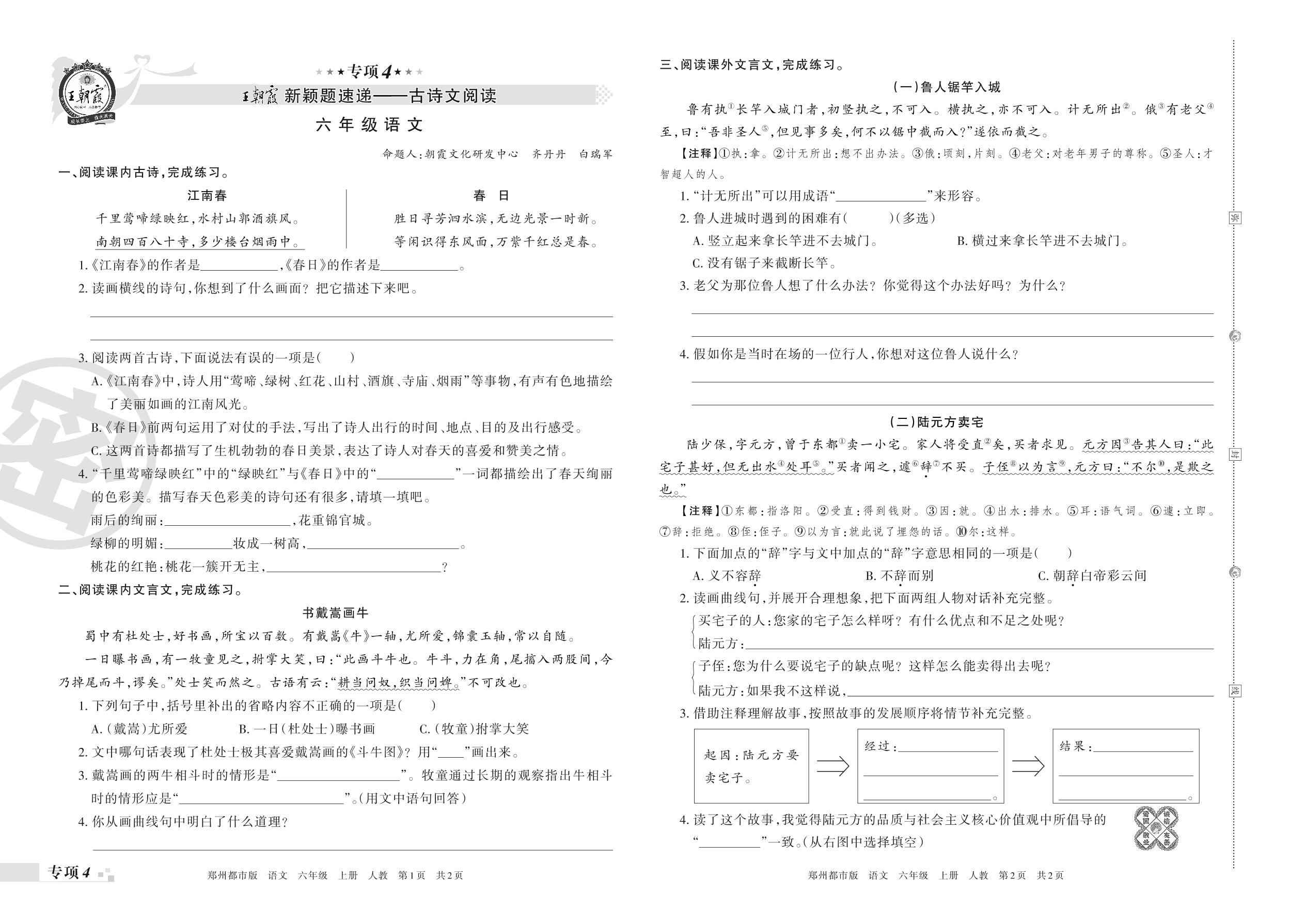 王朝霞期末专项卷——新颖题速递:古诗文阅读六年级上册语文(人教版)_R211223113640199【4】