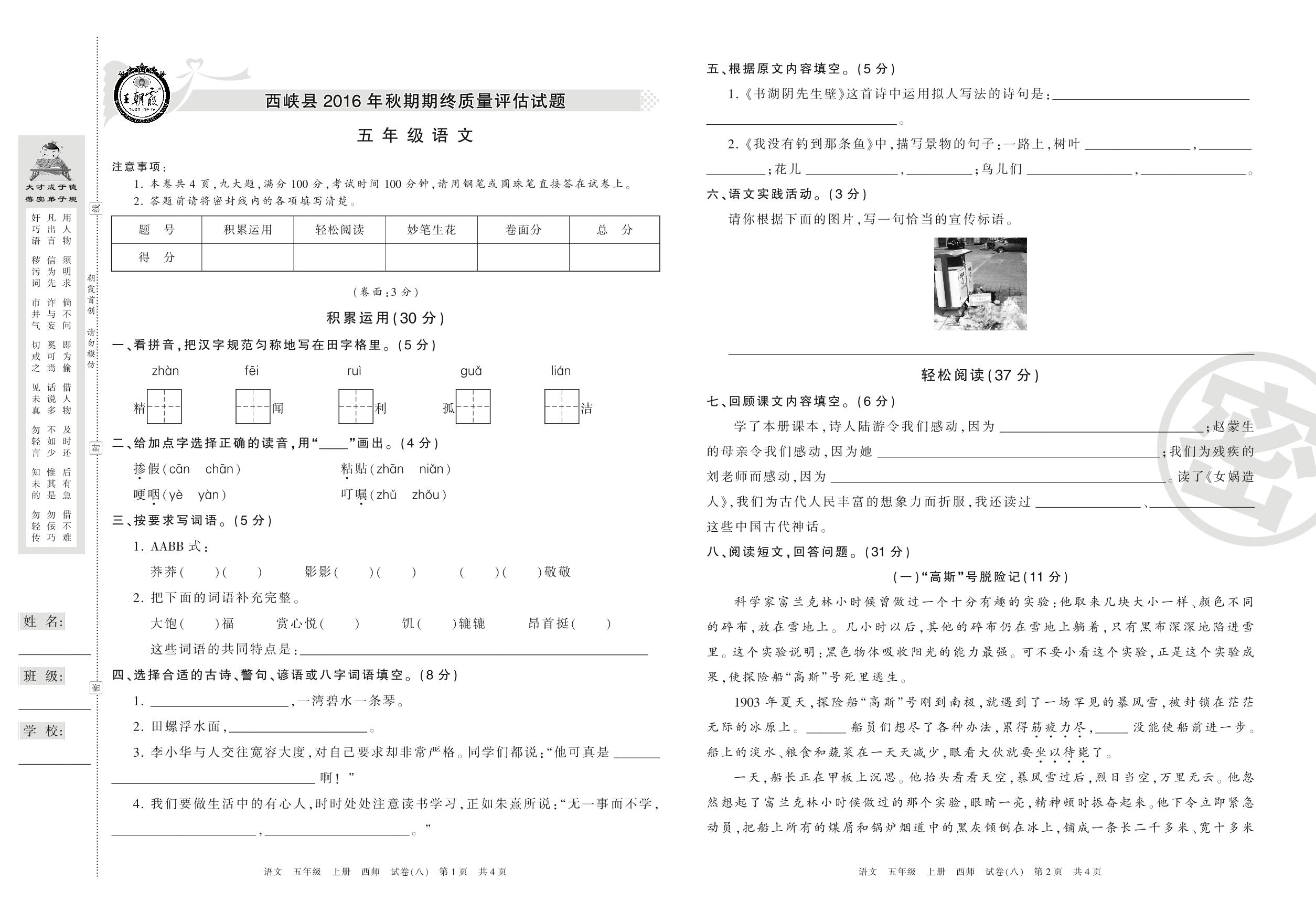 2016-2017学年第一学期南阳市西峡县五年级语文试卷(西师版)【8】