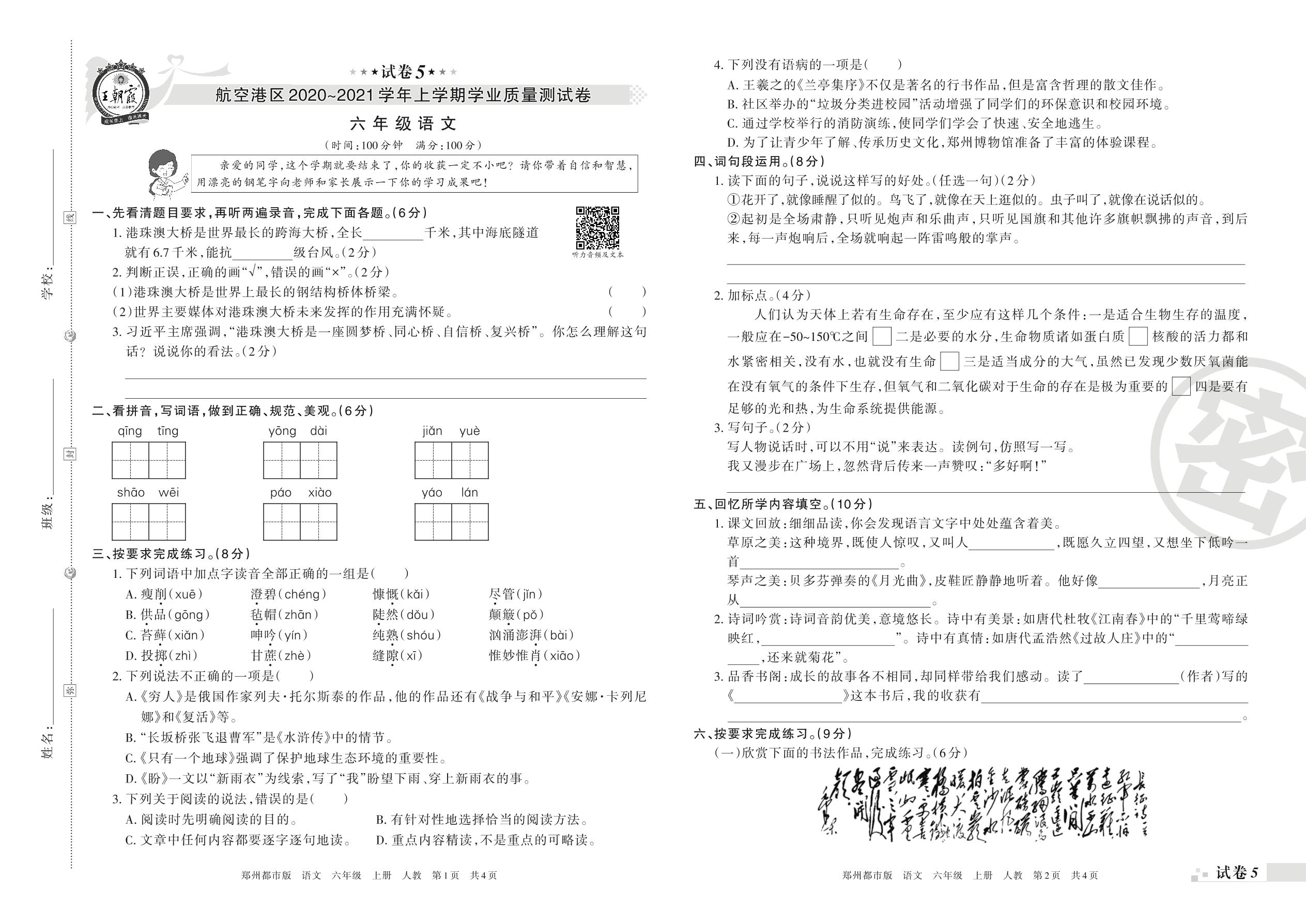 航空港区2020~2021学年上学期学业质量测试卷六年级语文(人教版)【5】