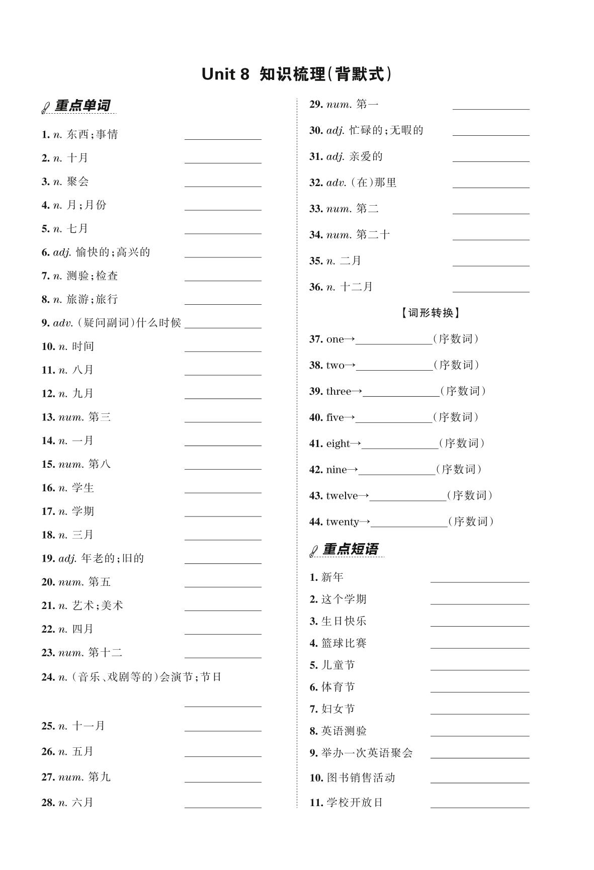 王朝霞期末过课本——Unit 8 知识梳理(背默式)七年级上册英语(人教版)【9】