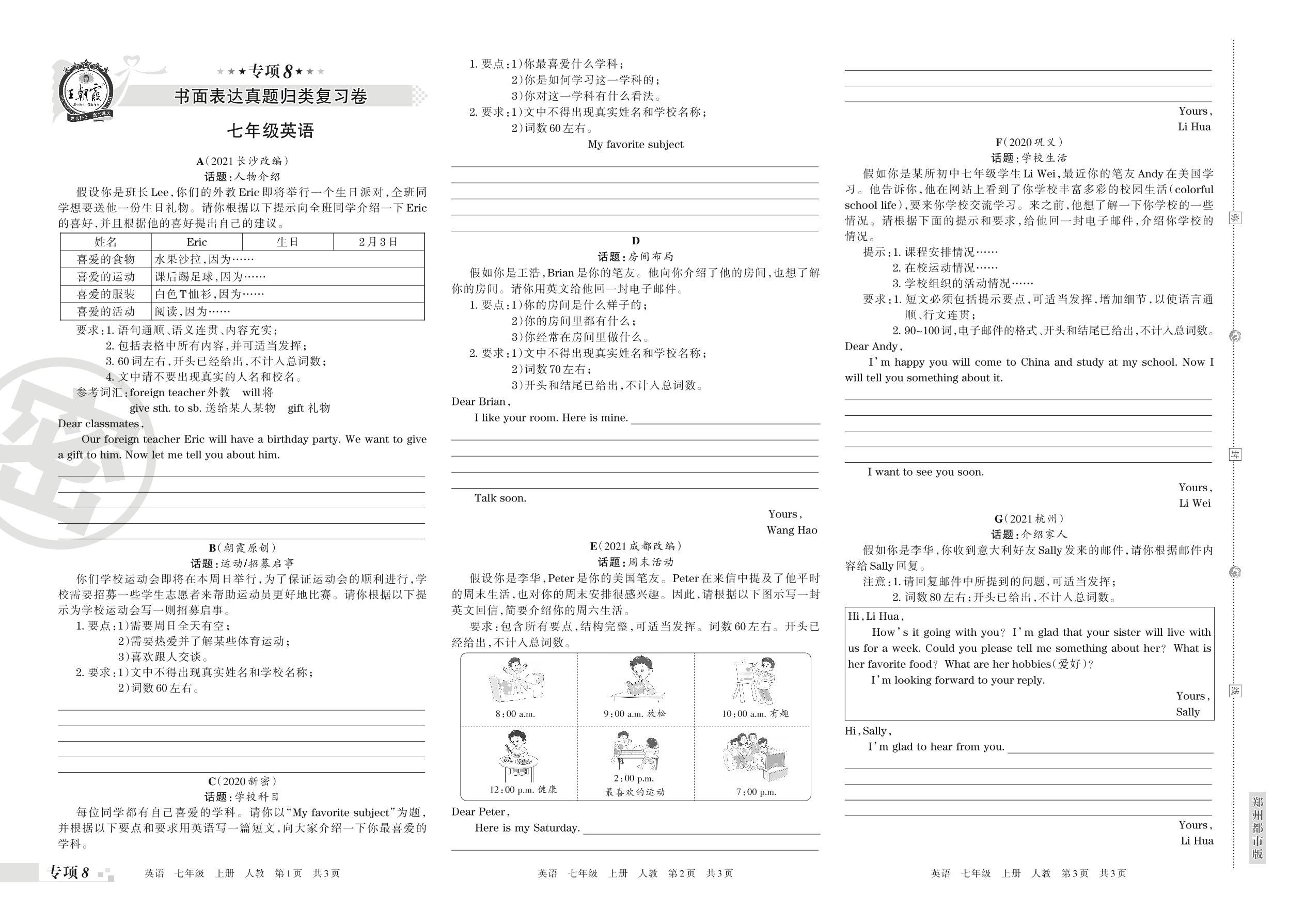 王朝霞期末专项卷——书面表达真题归类复习卷七年级上册英语(人教版)【8】