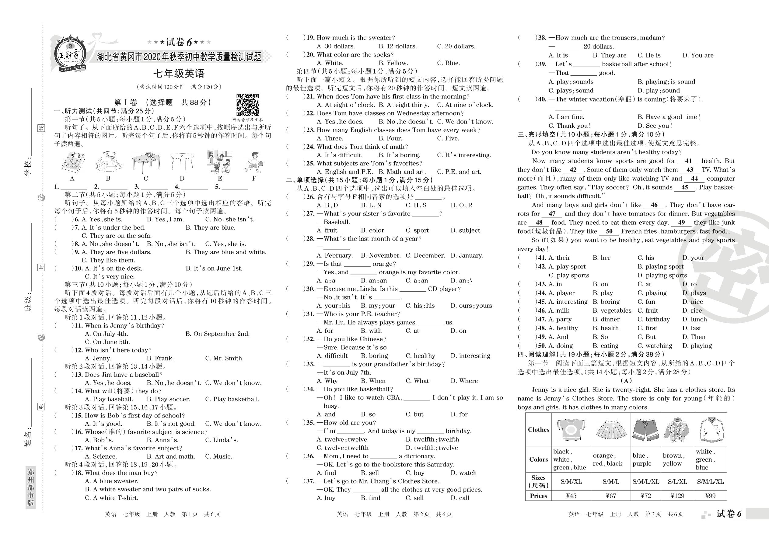 湖北省黄冈市2020年秋季初中教学质量检测试题七年级英语(人教版)【6】