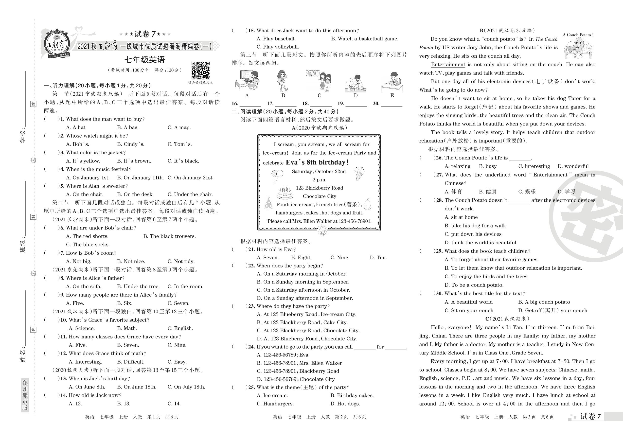七年级英语人教版上册期末卷