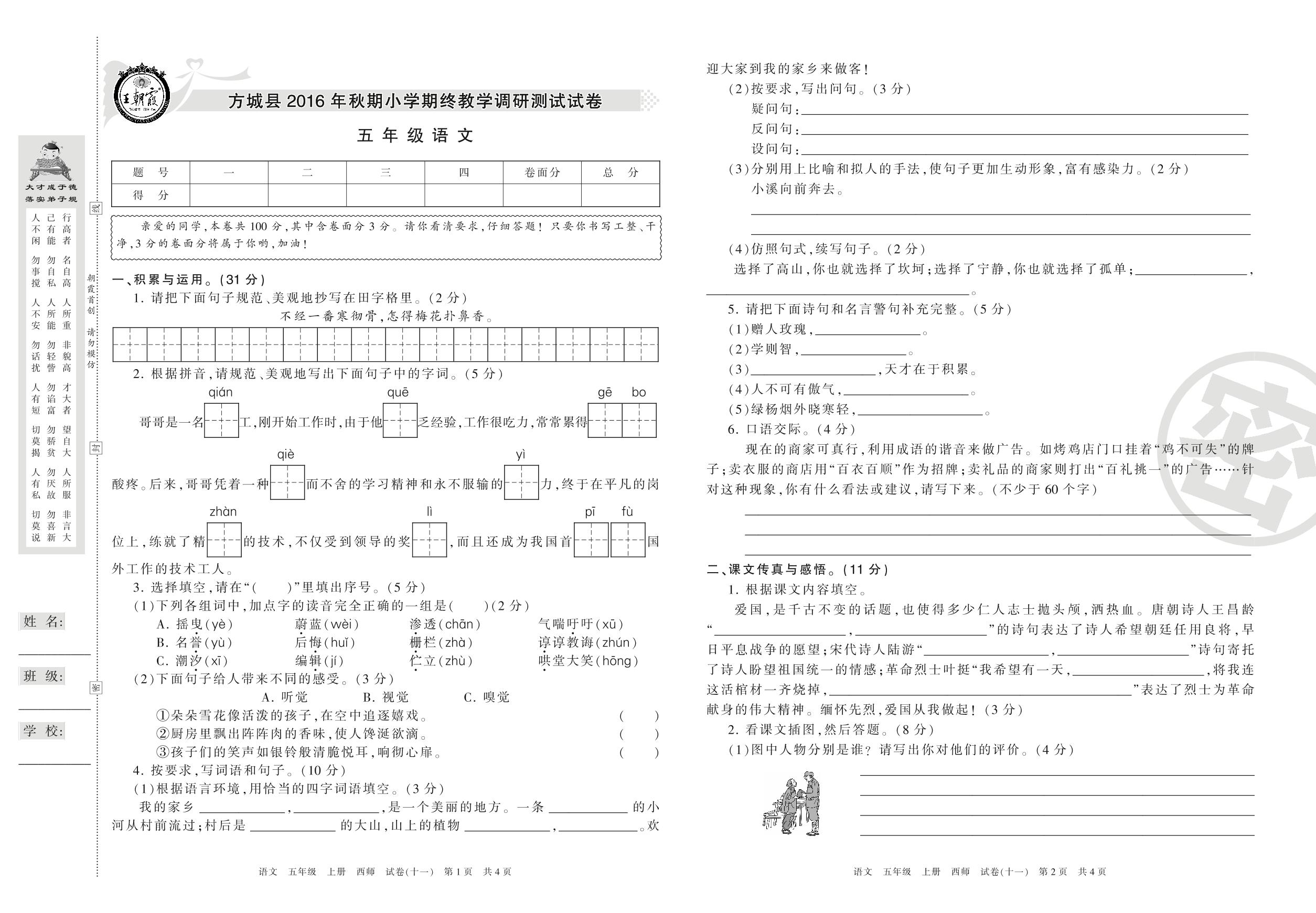2016-2017学年第一学期南阳市方城县五年级语文试卷(西师版)【11】