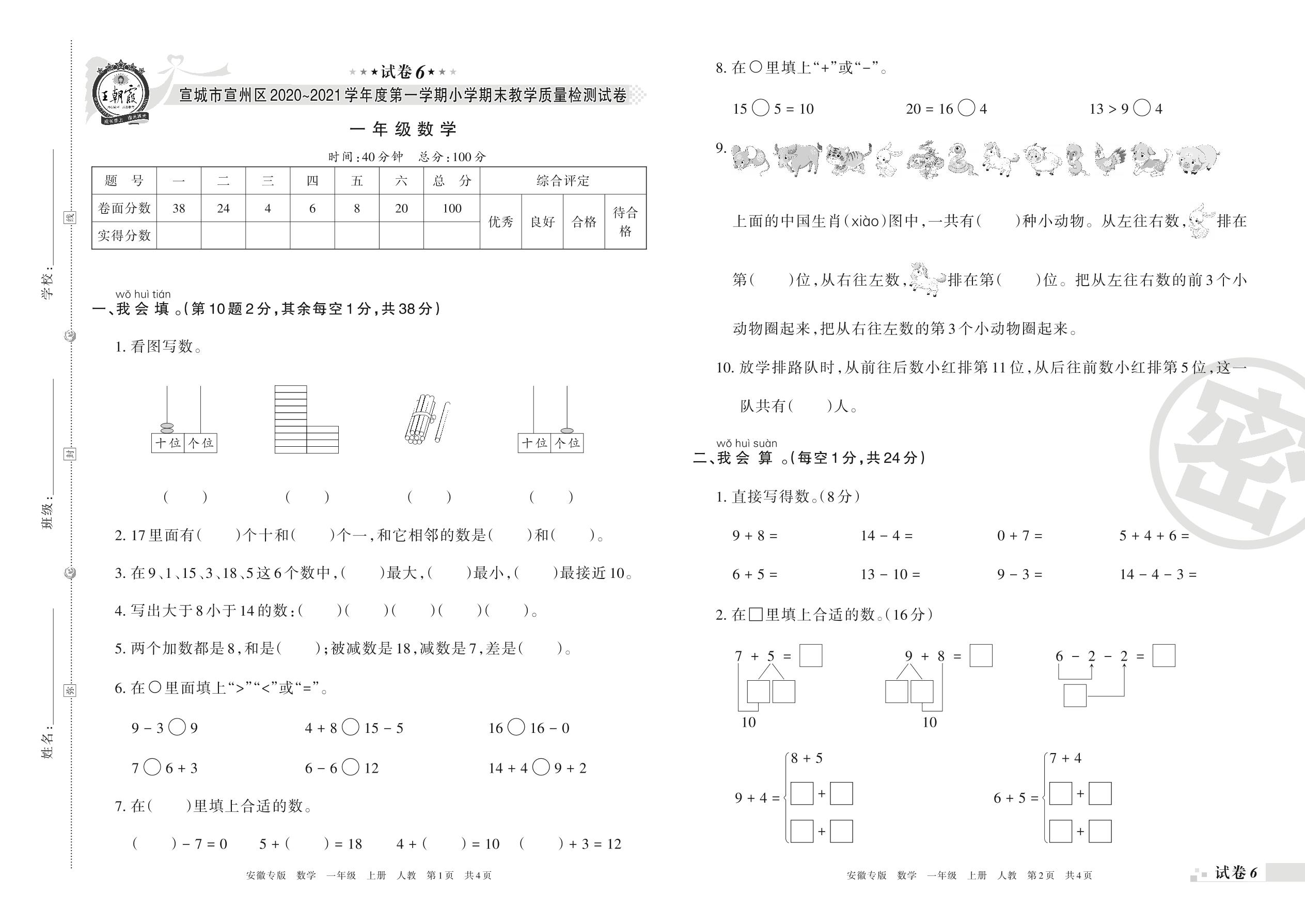 宣城市宣州区2020~2021学年度第一学期小学期末教学质量检测试卷一年级数学(人教版)【6】