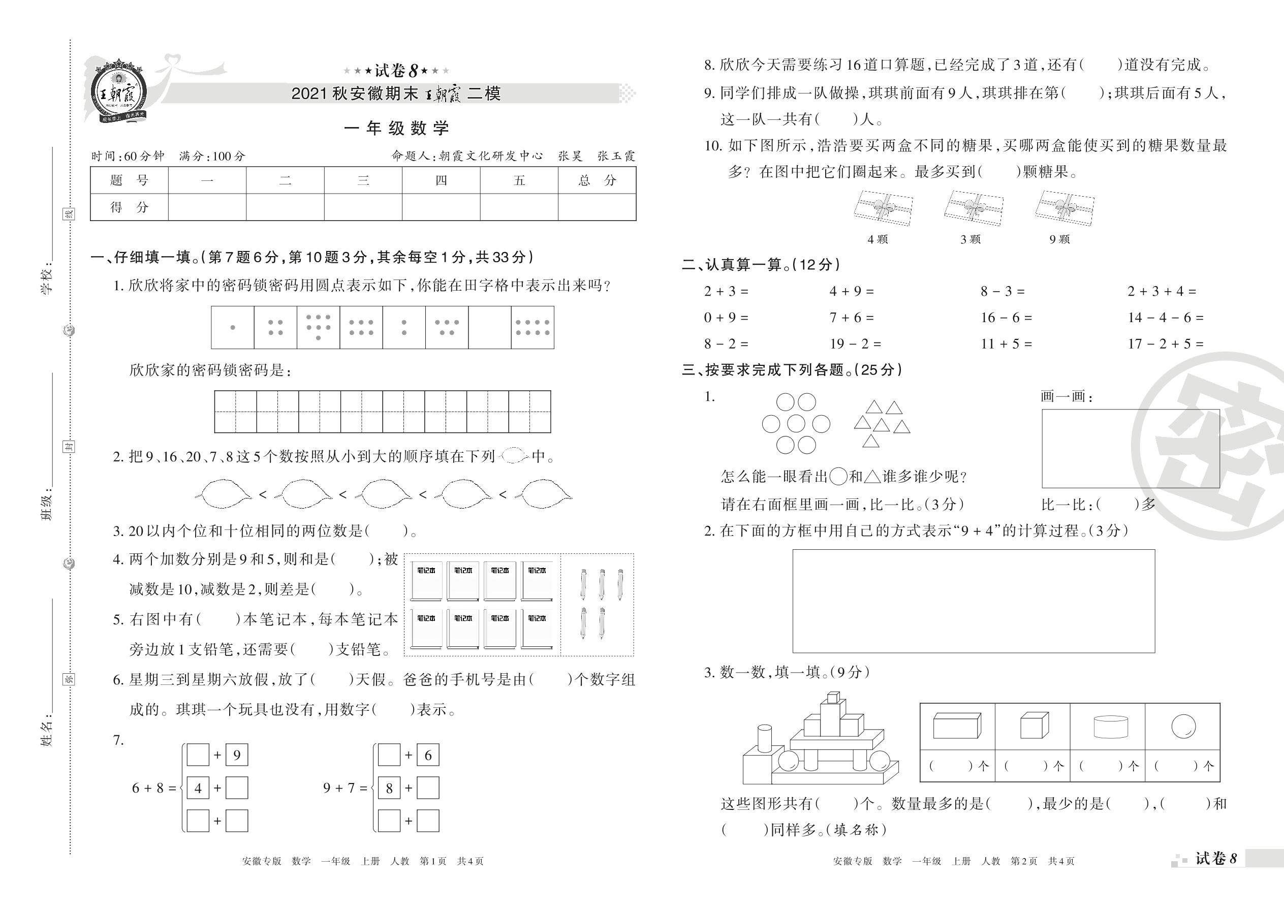 王朝霞期末模拟卷一年级上册数学(人教版)_R211223114743259【8】