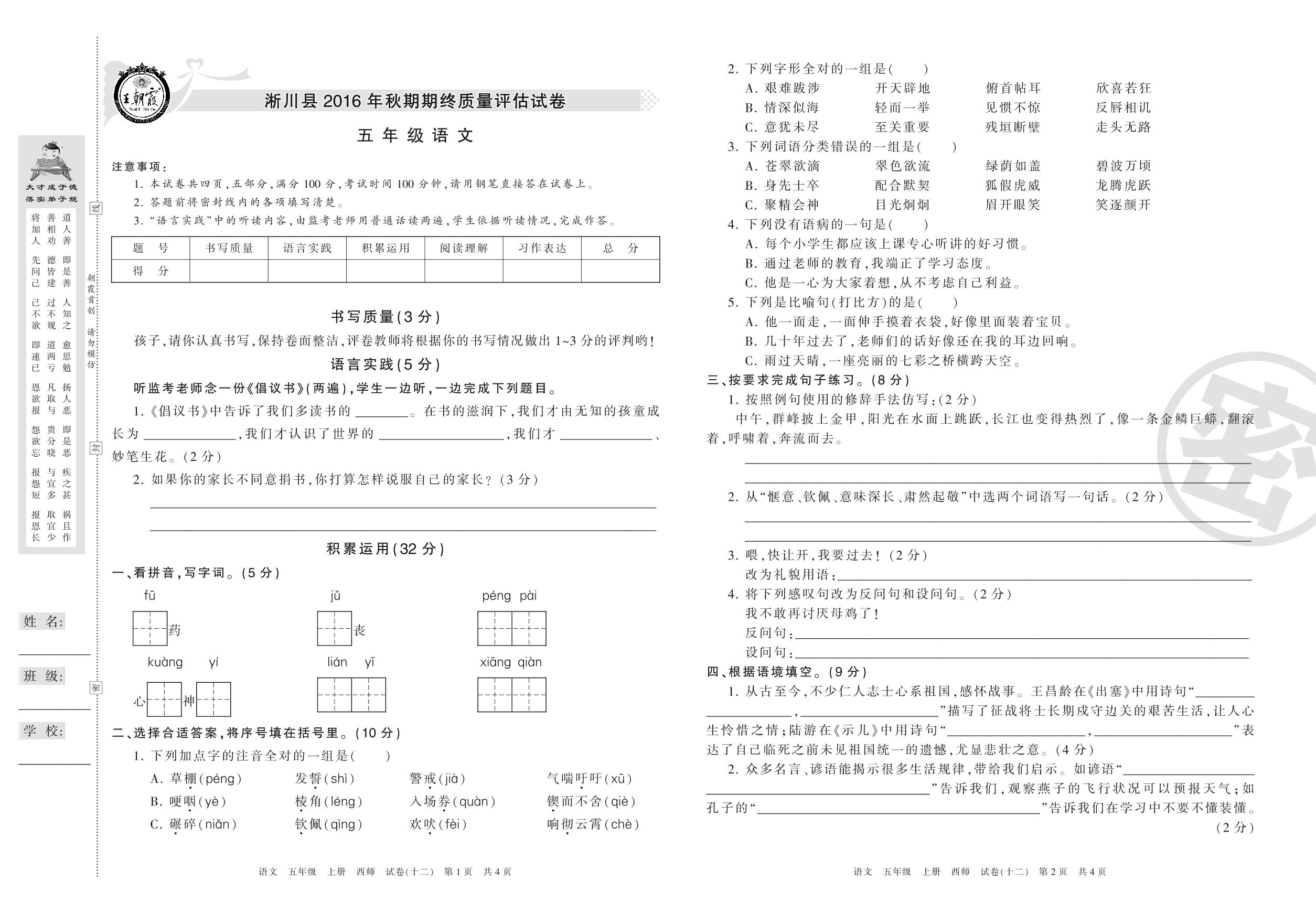 2016-2017学年第一学期南阳市淅川县五年级语文试卷(西师版)【12】