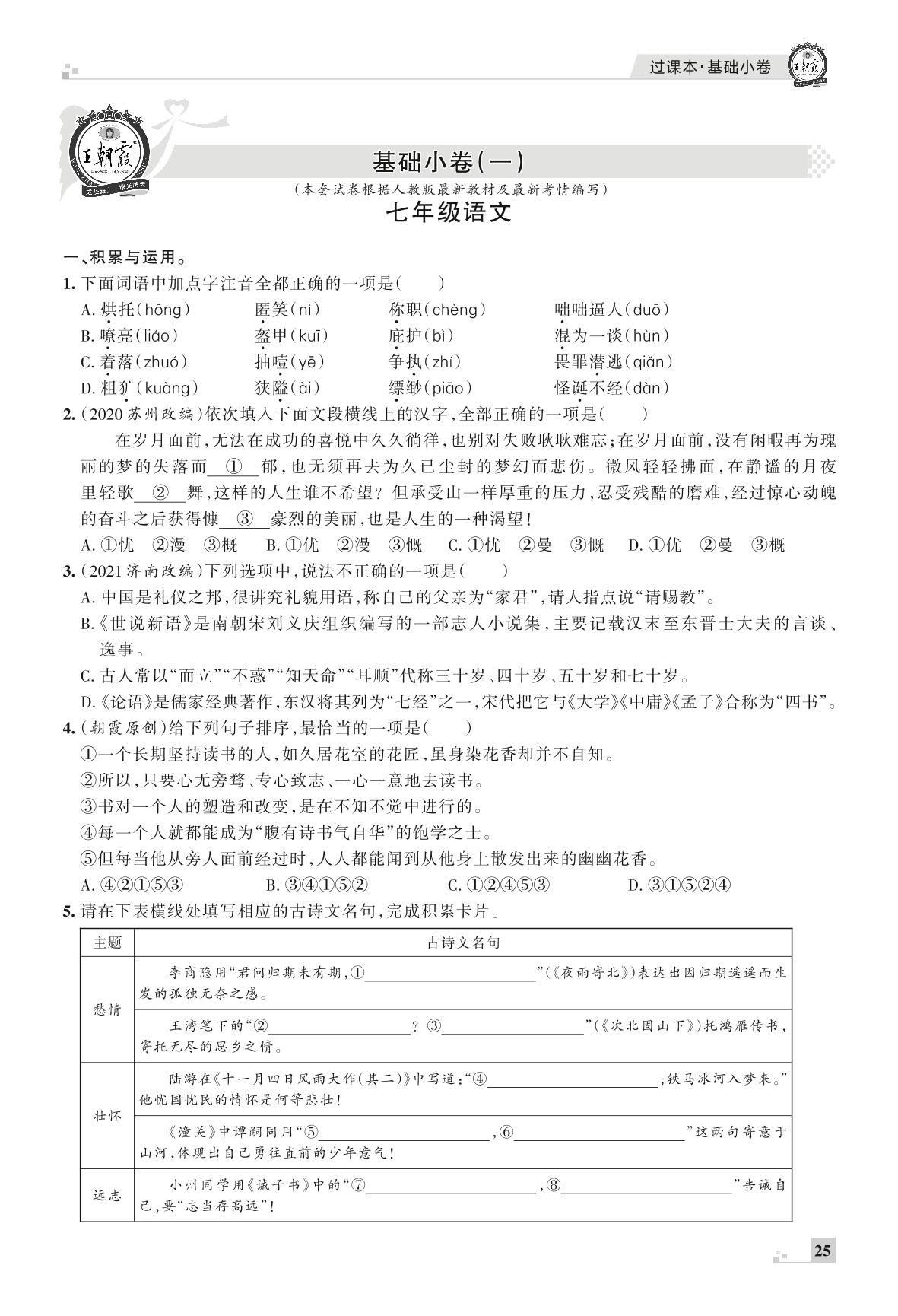 王朝霞期末过课本——基础小卷(一)七年级上册语文(人教版)_R211223114823752【7】