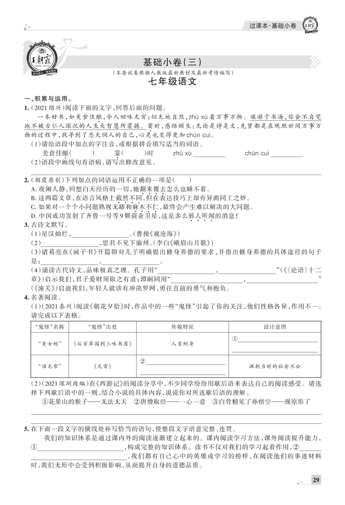 王朝霞期末过课本——基础小卷(三)七年级上册语文(人教版)【9】