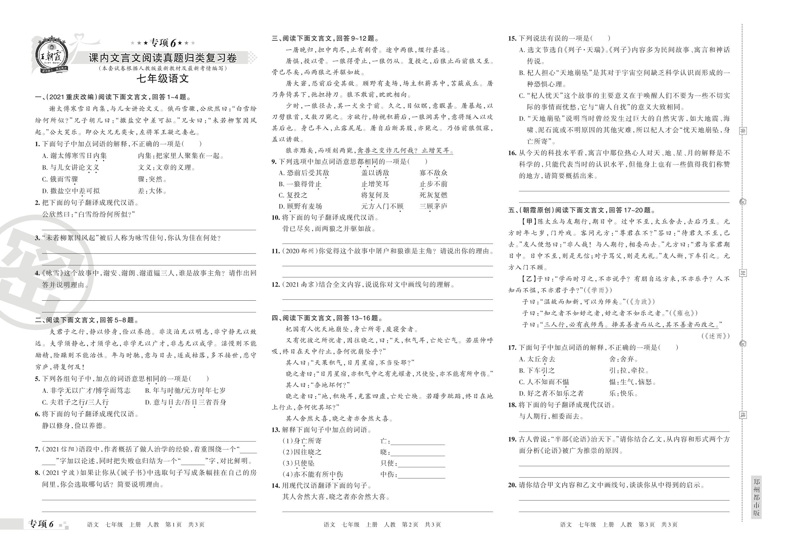 王朝霞期末专项卷——课内文言文阅读真题归类复习卷七年级上册语文(人教版)【6】