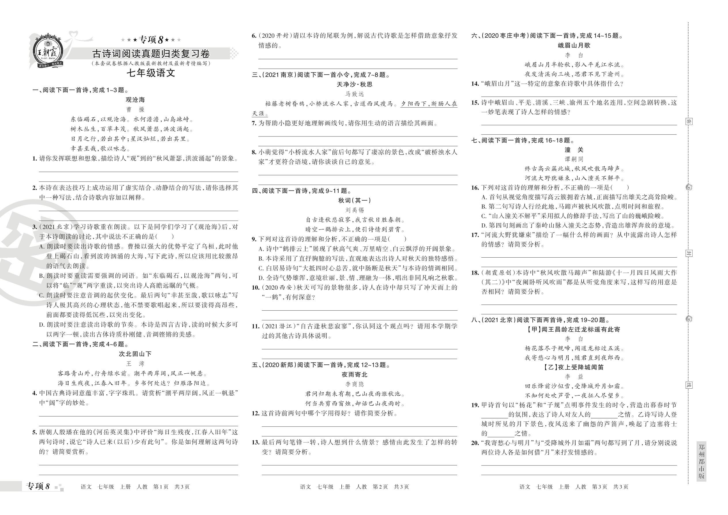 王朝霞期末专项卷——古诗词阅读真题归类复习卷七年级上册语文(人教版)【8】