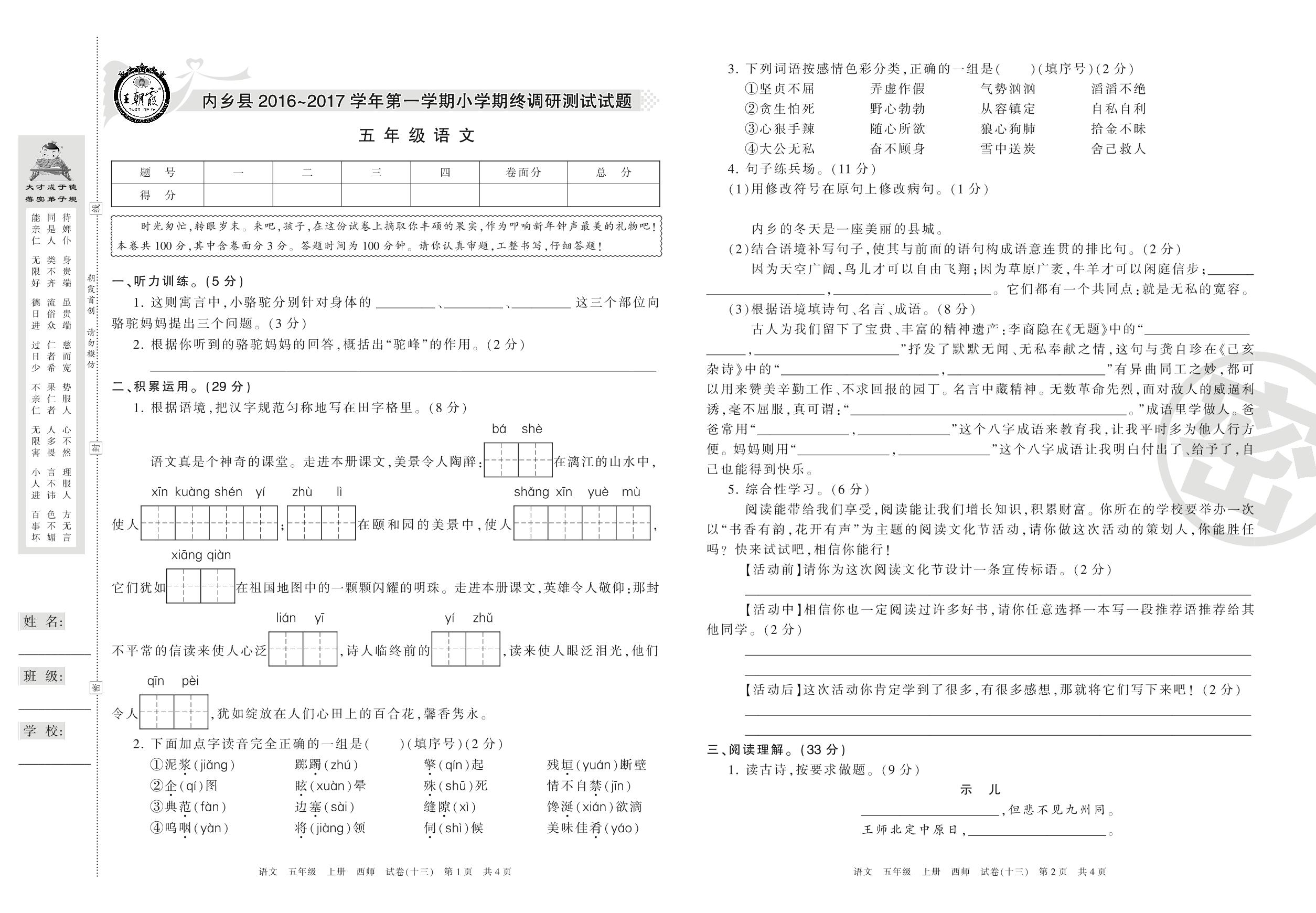 2016-2017学年第一学期南阳市内乡县五年级语文试卷(西师版)【13】