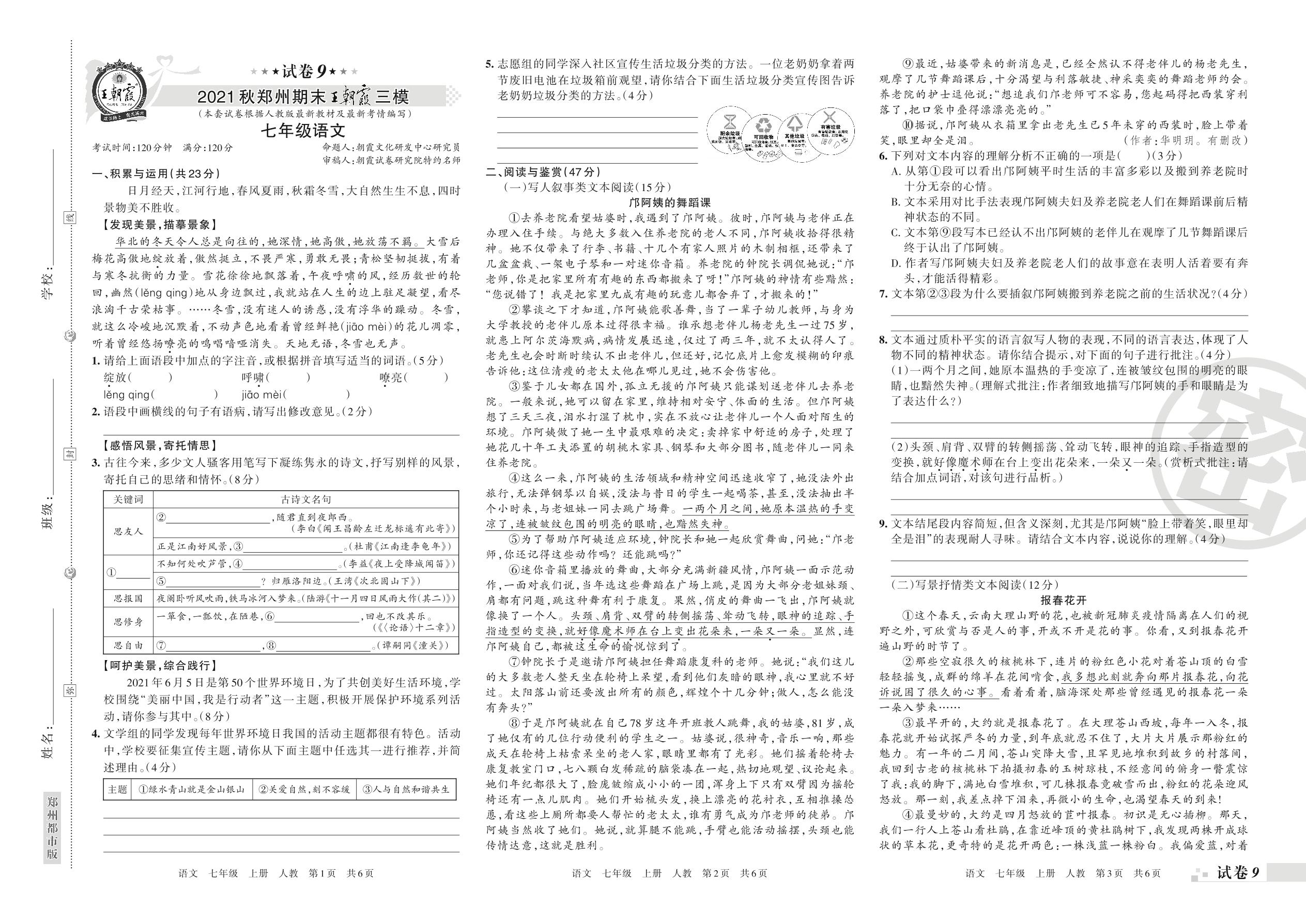王朝霞期末模拟卷七年级上册语文(人教版)【9】
