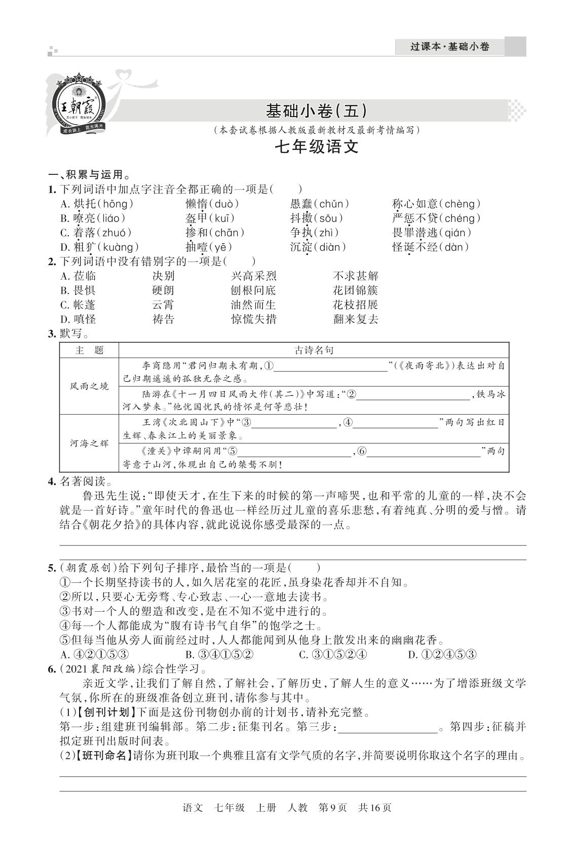 王朝霞期末过课本——基础小卷(五)七年级上册语文(人教版)【11】