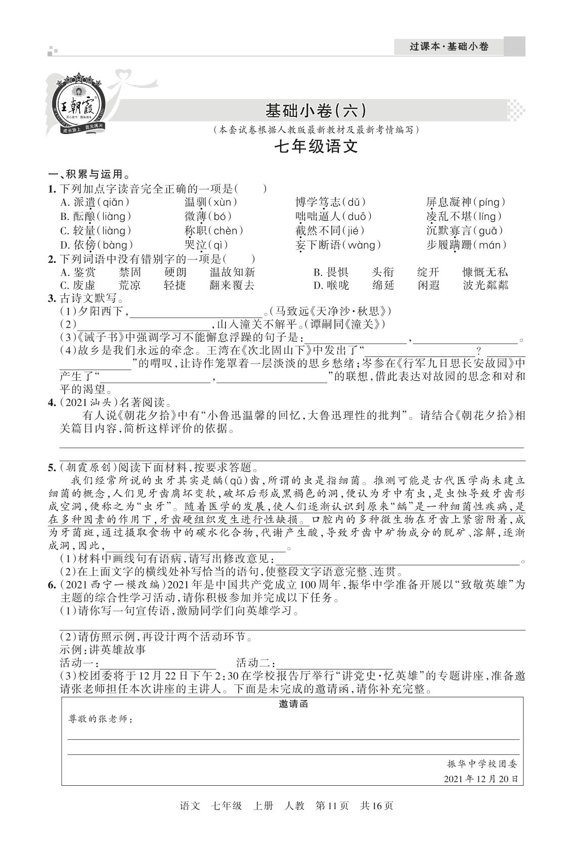 王朝霞期末过课本——基础小卷(六)七年级上册语文(人教版)【12】