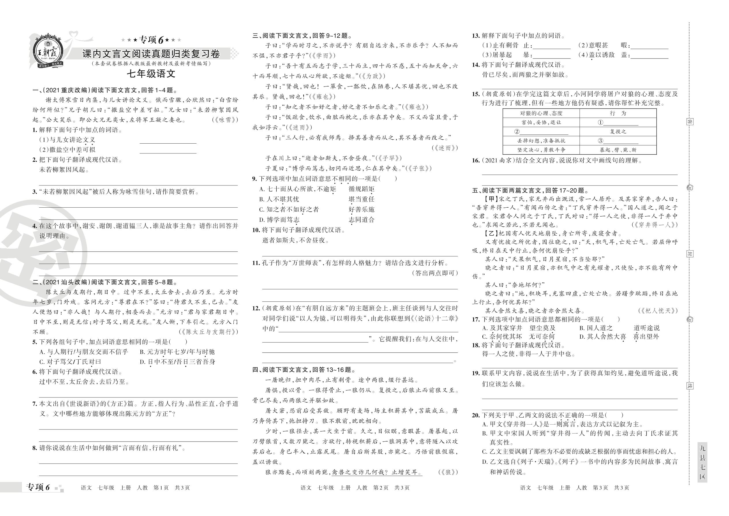 王朝霞期末专项卷——课内文言文阅读真题归类复习卷七年级上册语文(人教版)_R211223115557289【6】