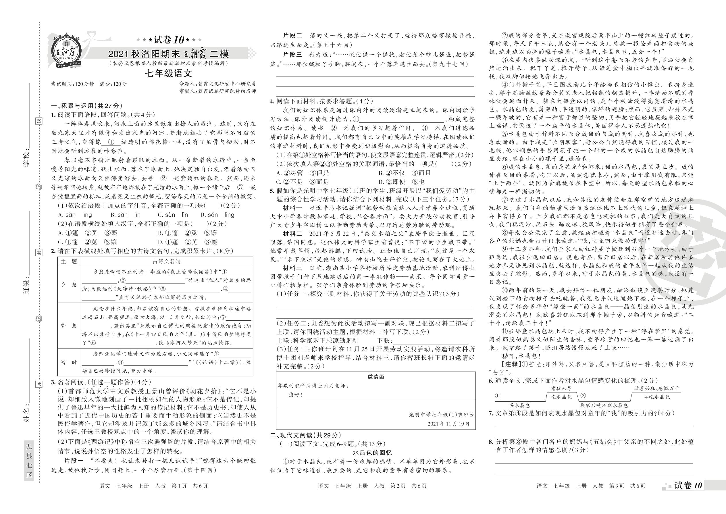 王朝霞期末模拟卷七年级上册语文(人教版)【10】