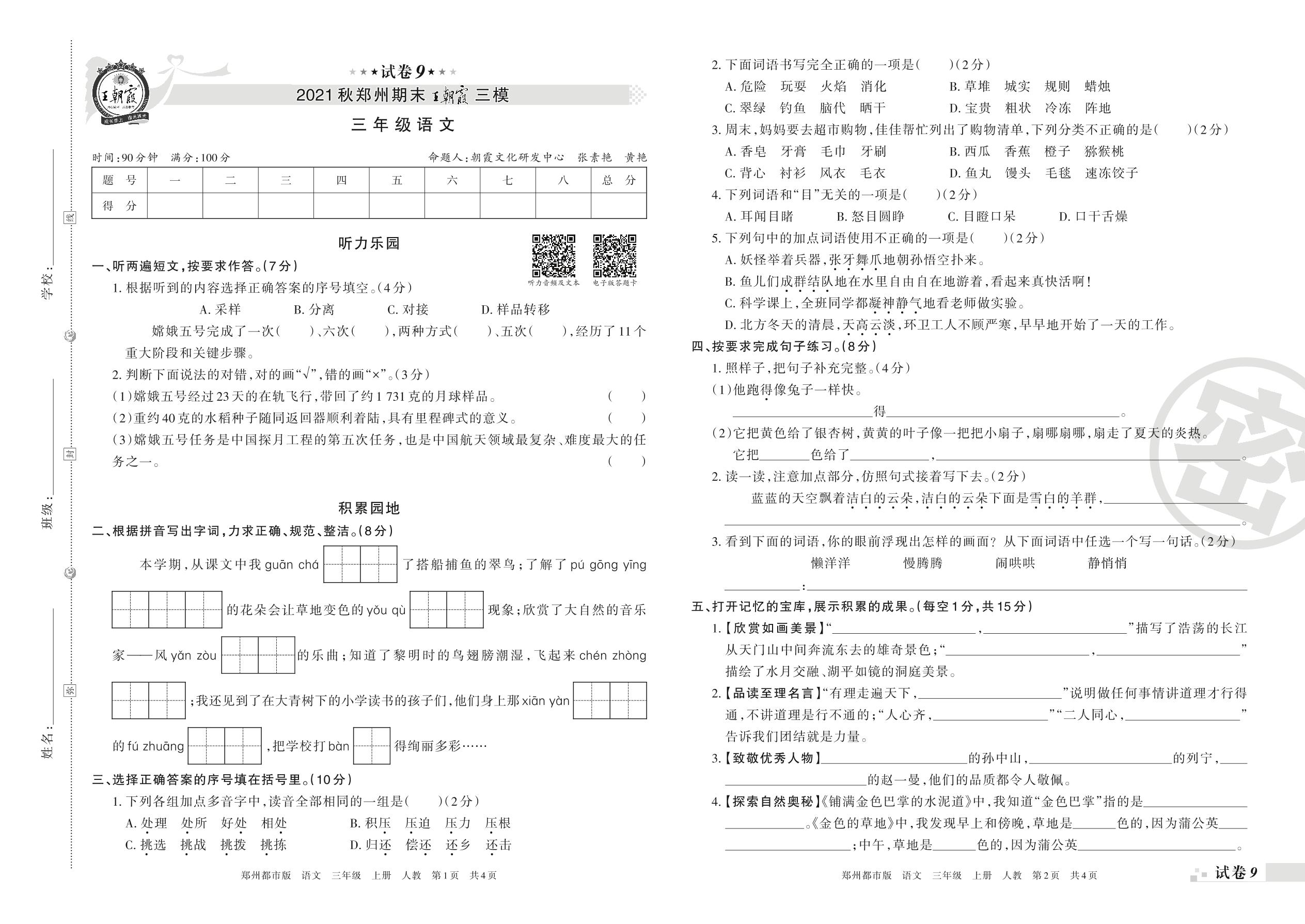 王朝霞期末模拟卷三年级上册语文(人教版)_R211223115718438【9】