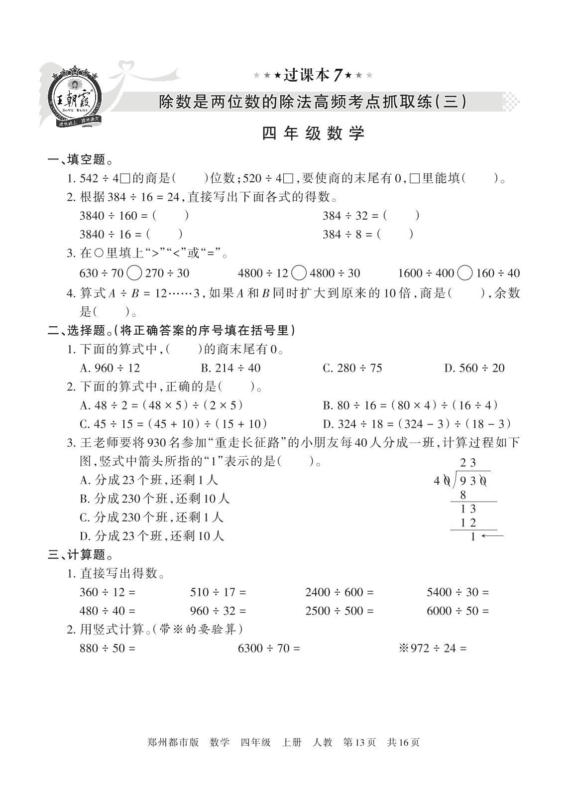 王朝霞期末过课本——除数是两位数的除法高频考点抓取练(三)四年级上册数学(人教版)_R211223120117163【7】