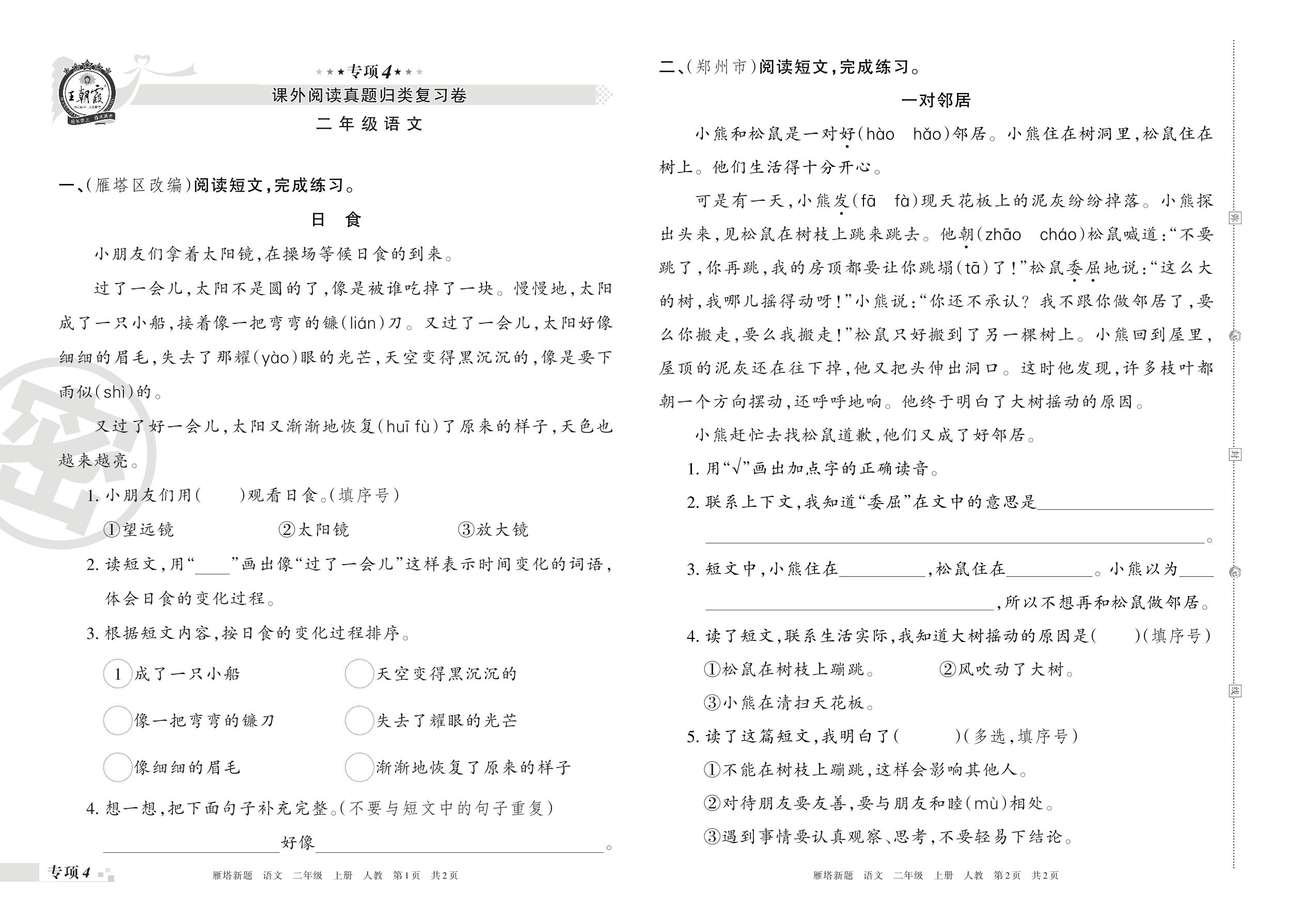 王朝霞期末专项卷——课外阅读真题归类复习卷二年级上册语文(人教版)【4】