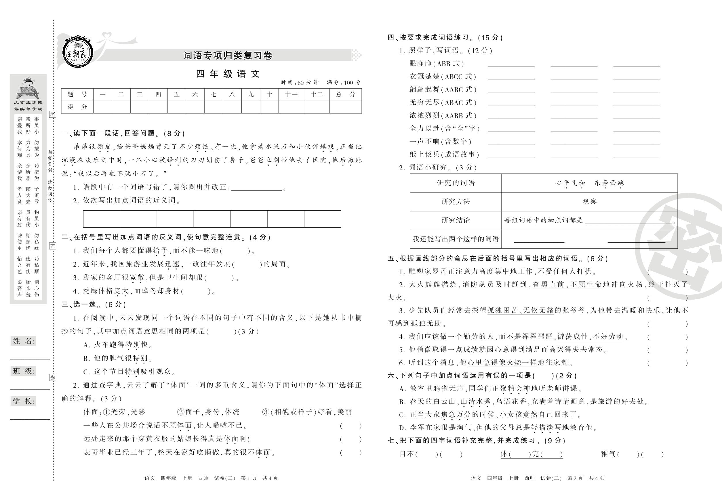 王朝霞期末专项卷四年级上册语文(西师版)_R210801213716【2】