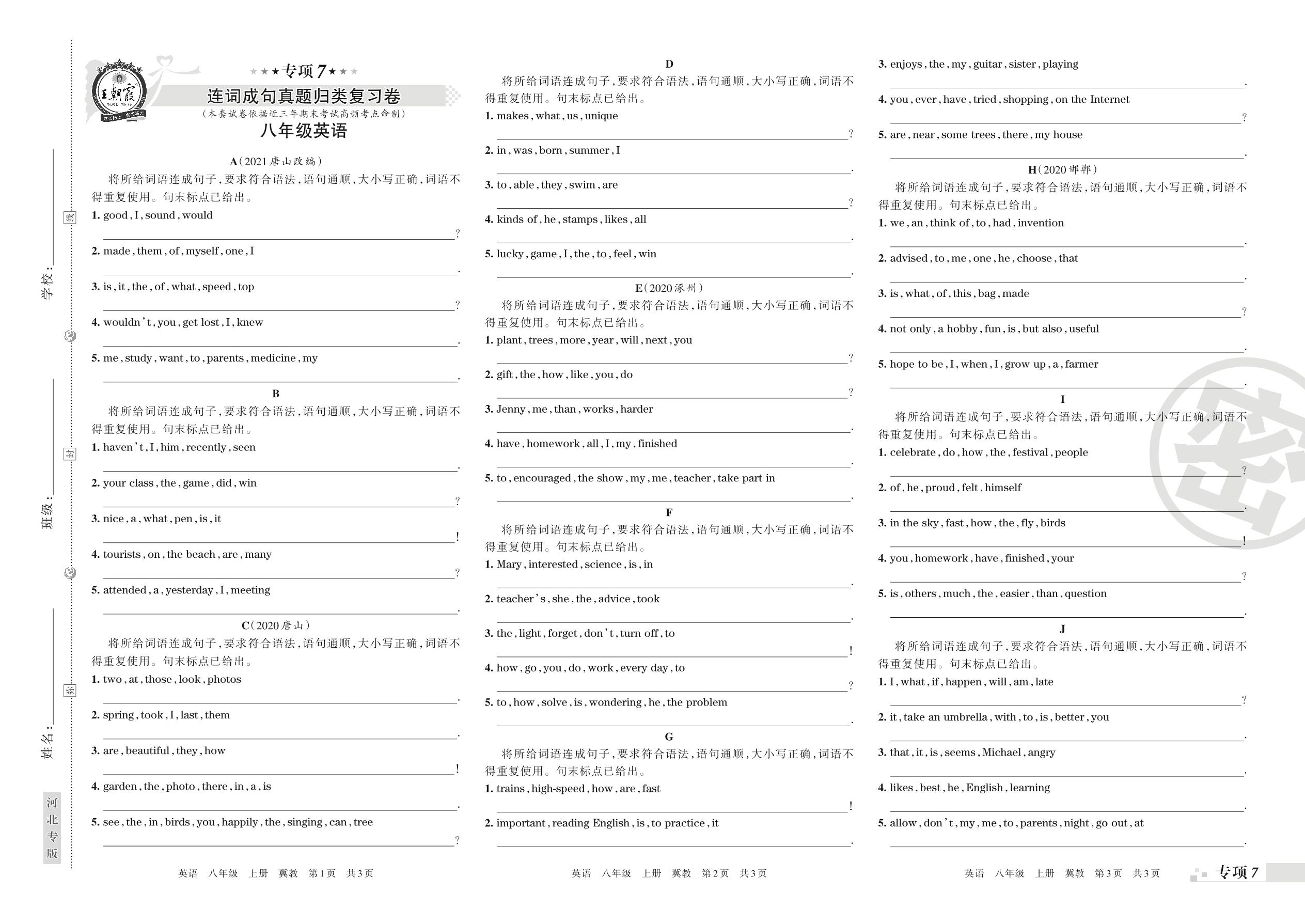 王朝霞期末专项卷——连词成句真题归类复习卷八年级上册英语(冀教版)【7】