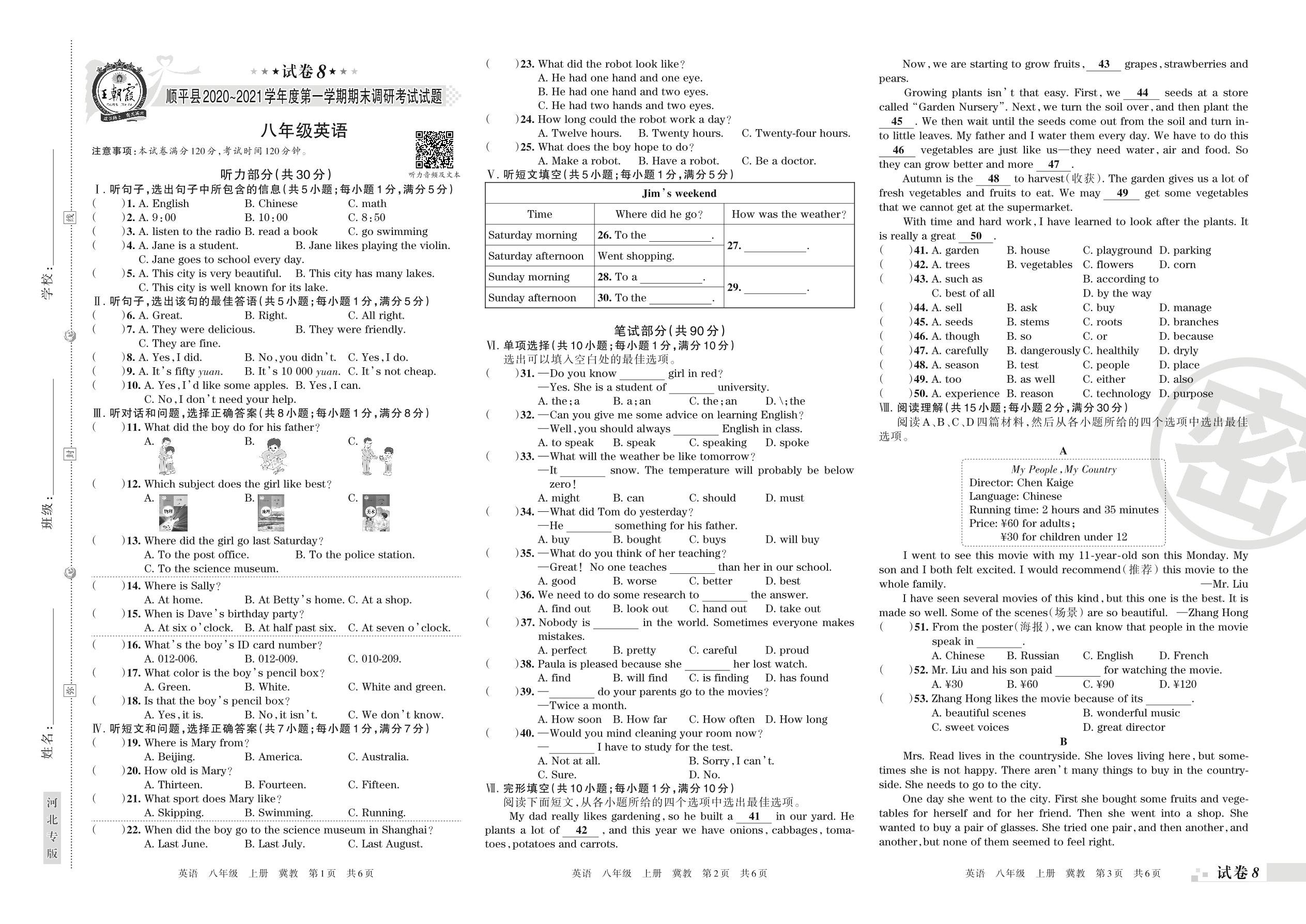 顺平县2020~2021学年度第一学期期末调研考试试题八年级英语(冀教版)【8】