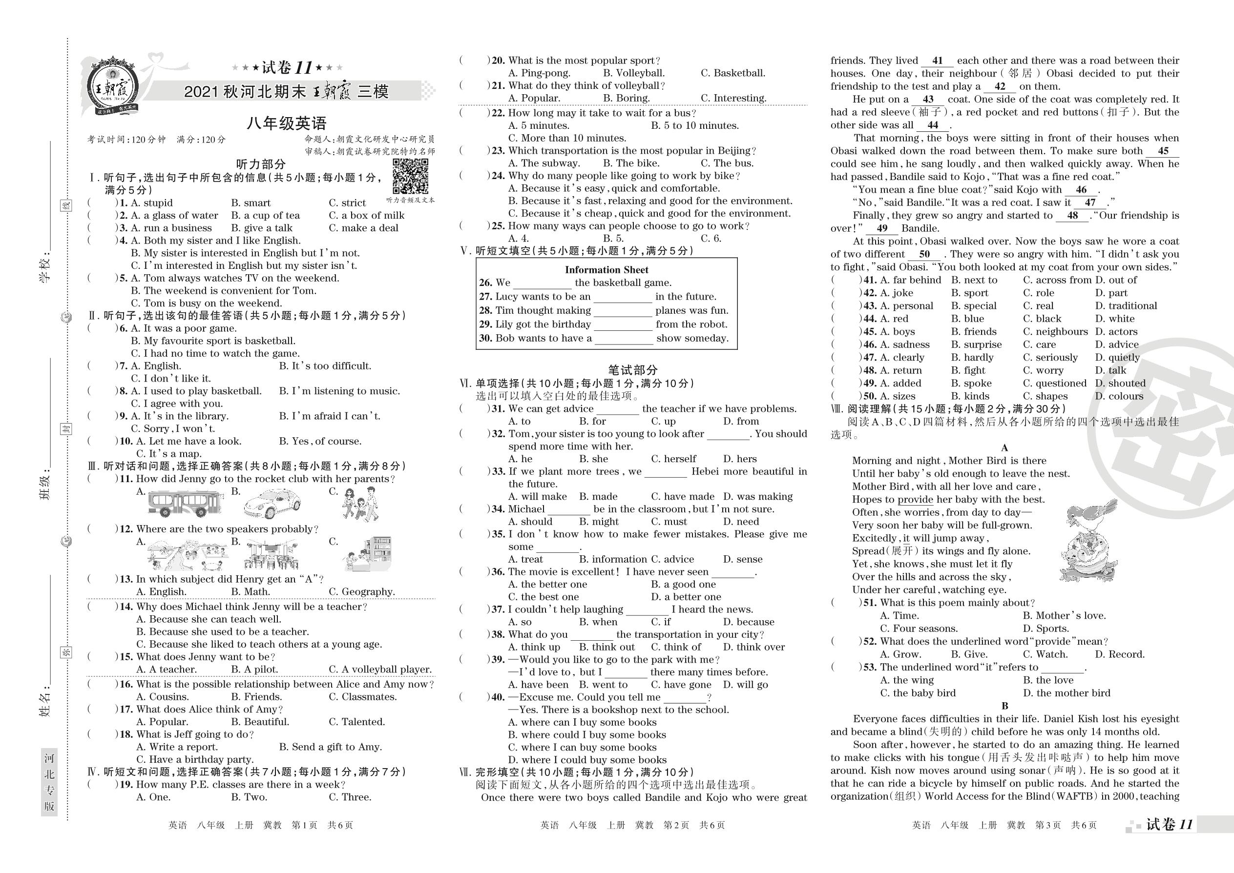 王朝霞期末模拟卷八年级上册英语(冀教版)【11】