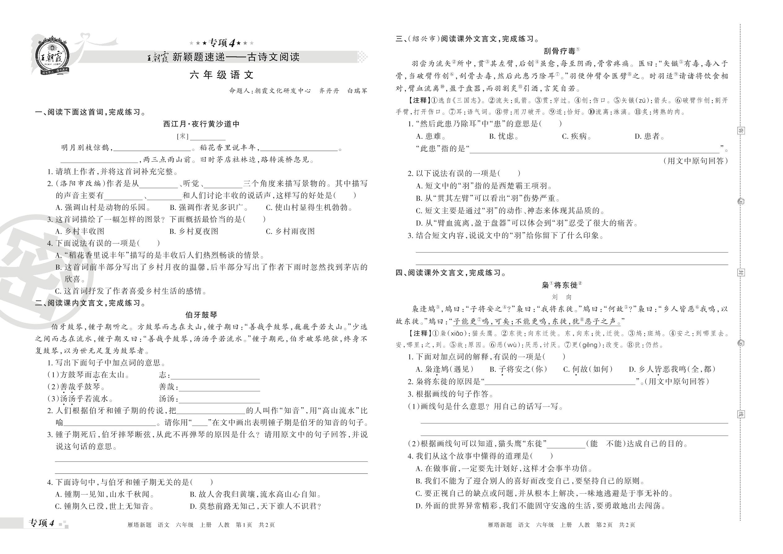 王朝霞期末专项卷——新颖题速递:古诗文阅读六年级上册语文(人教版)_R211223135354535【4】
