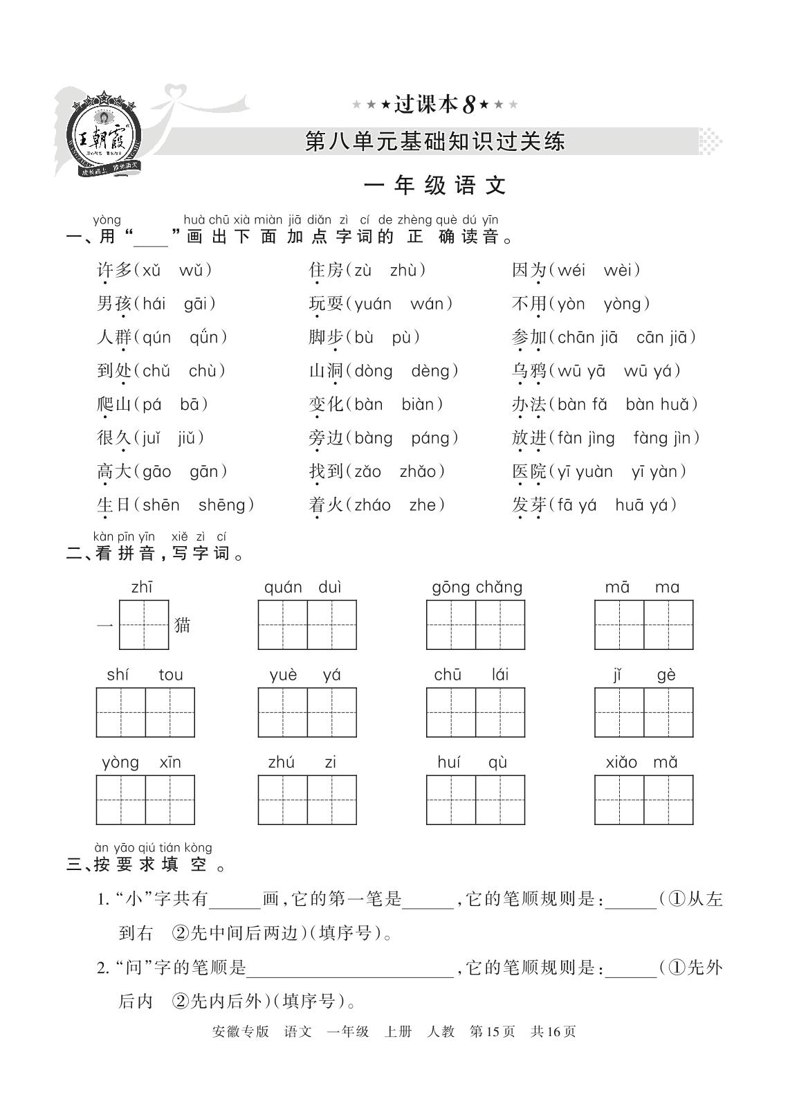 王朝霞期末过课本——第八单元基础知识过关练一年级上册语文(人教版)【8】