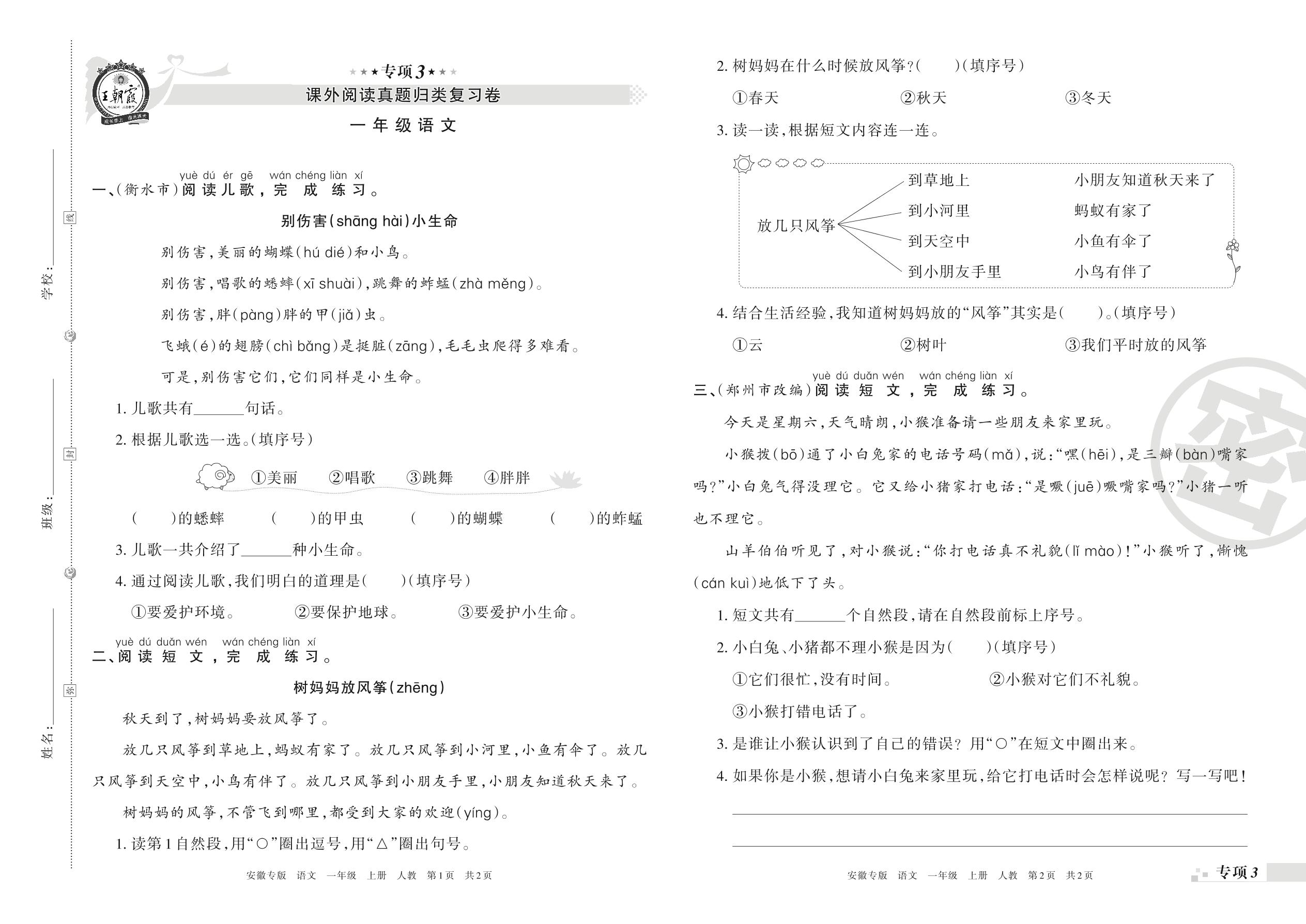 王朝霞期末专项卷——课外阅读真题归类复习卷一年级上册语文(人教版)_R211223135639188【3】