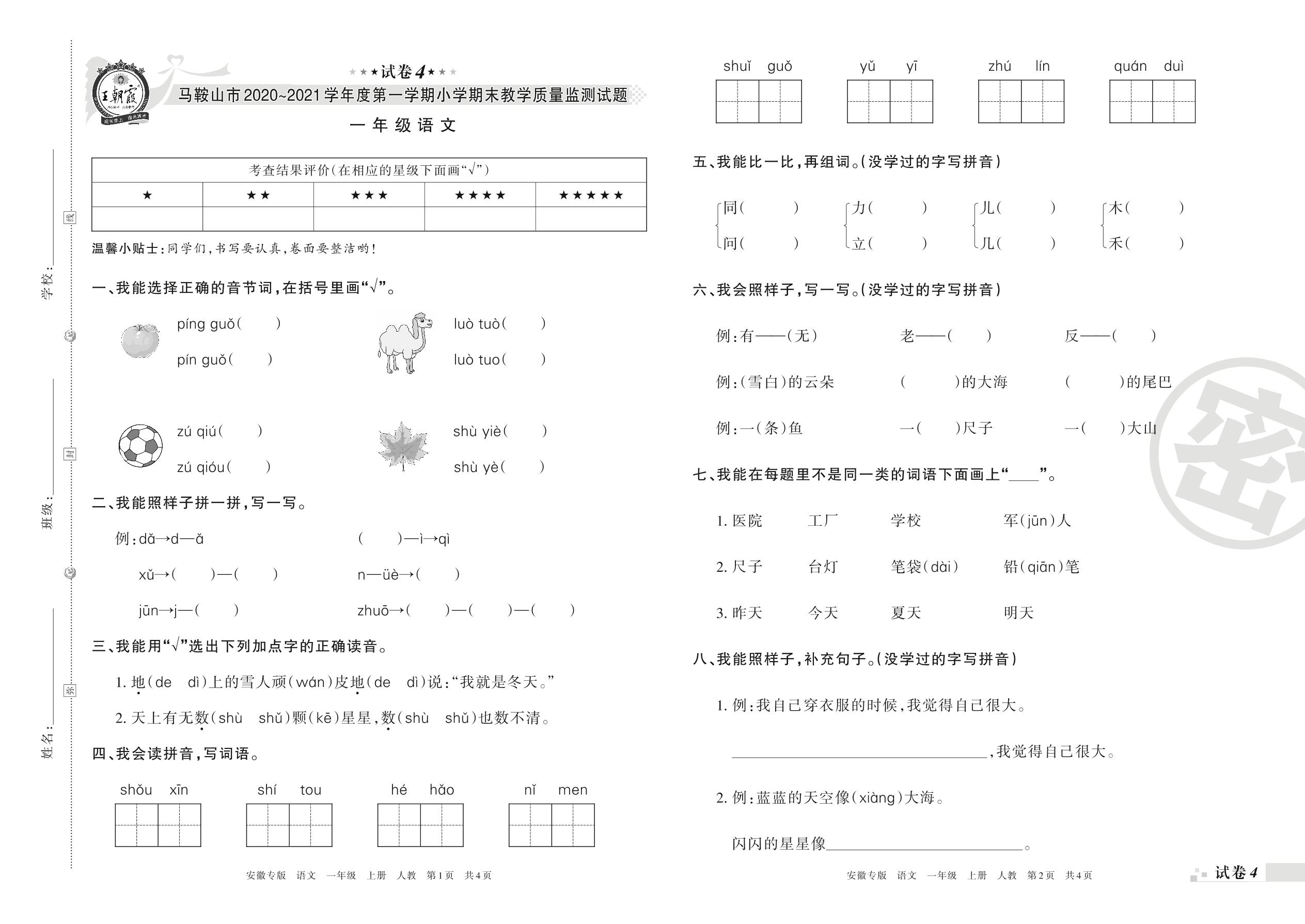 马鞍山市2020~2021学年度第一学期小学期末教学质量监测试题一年级语文(人教版)【4】