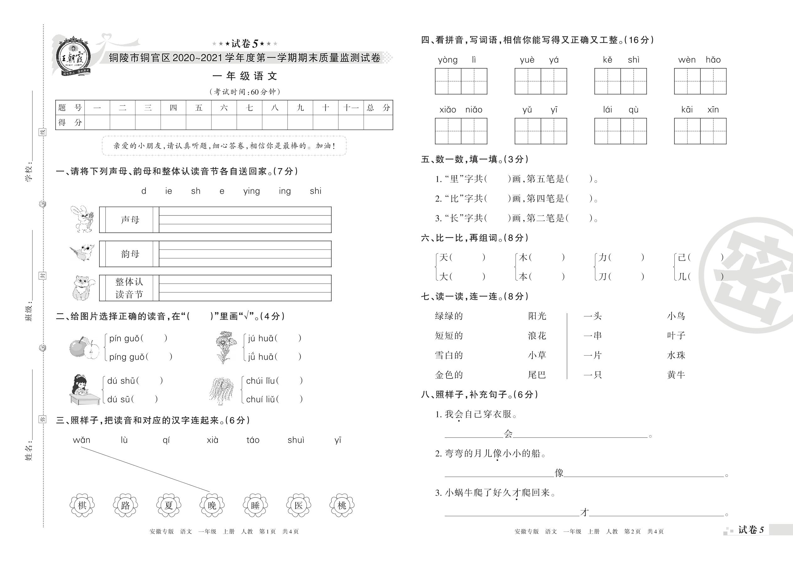 铜陵市铜官区2020~2021学年度第一学期期末质量监测试卷一年级语文(人教版)【5】