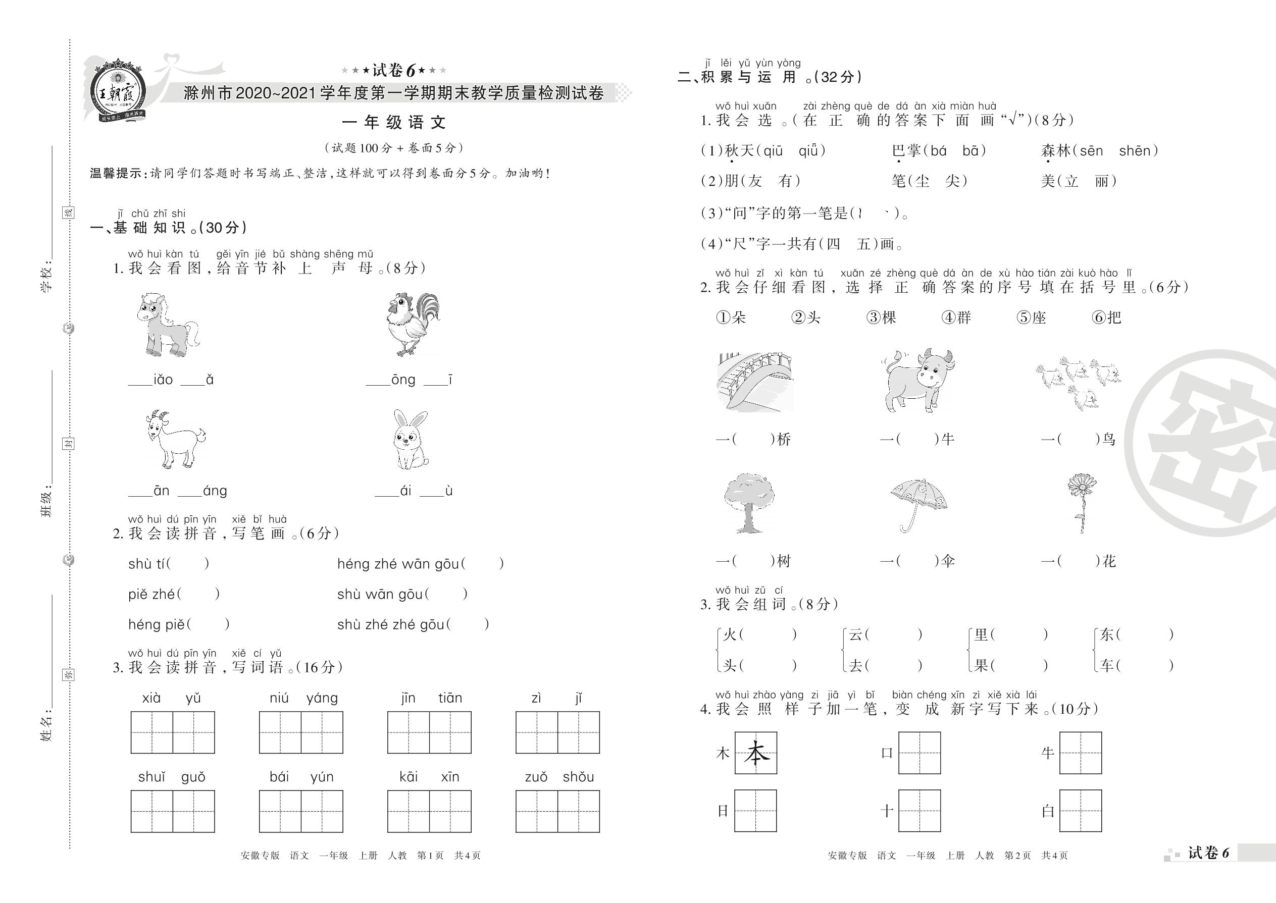 滁州市2020~2021学年度第一学期期末教学质量检测试卷一年级语文(人教版)【6】