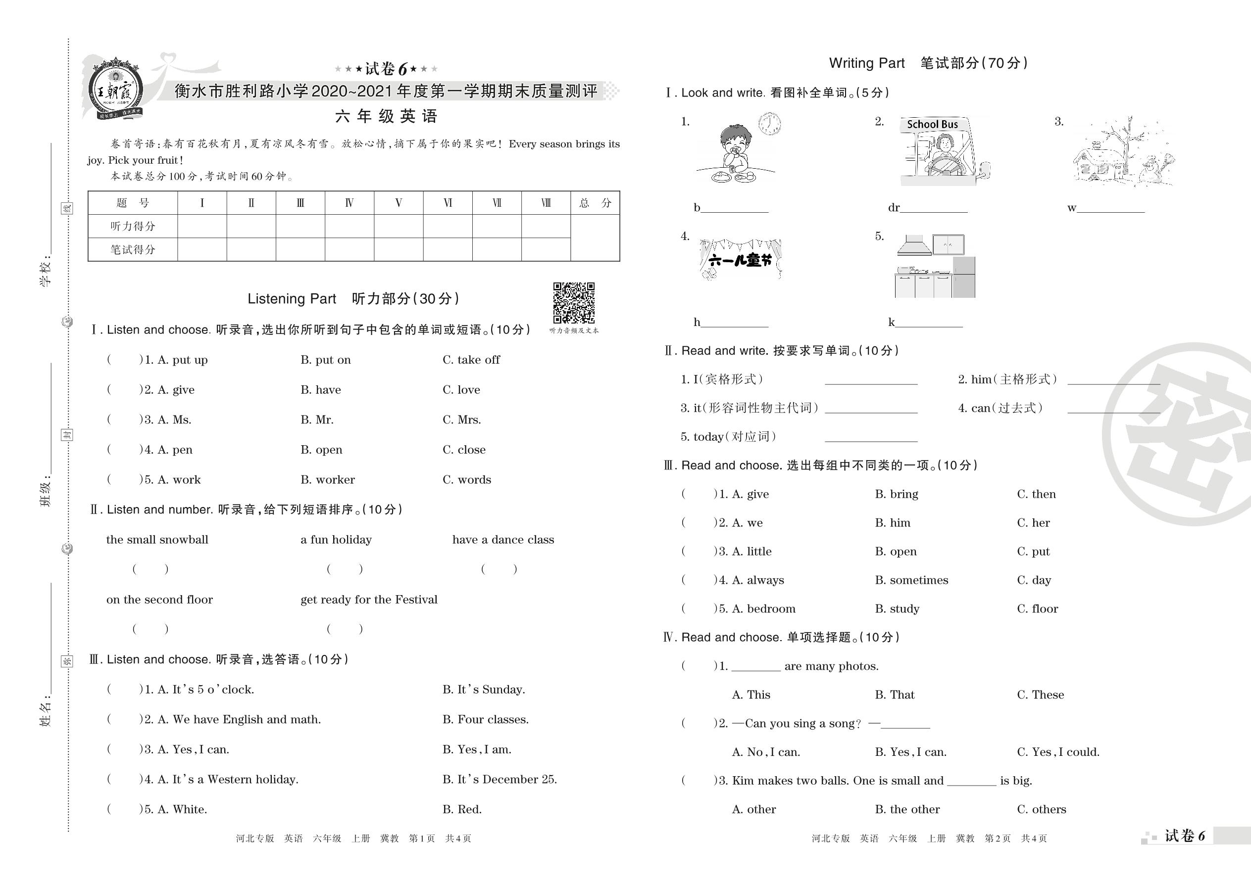 衡水市胜利路小学2020~2021年度第一学期期末质量测评六年级英语(冀教版)【6】