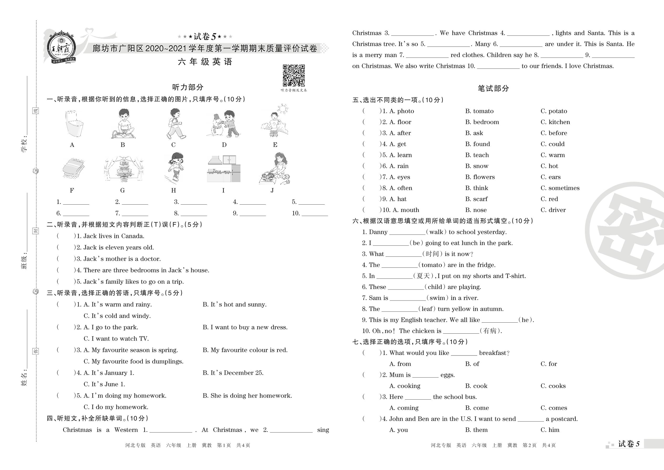 廊坊市广阳区2020~2021学年度第一学期期末质量评价试卷六年级英语(冀教版)【5】