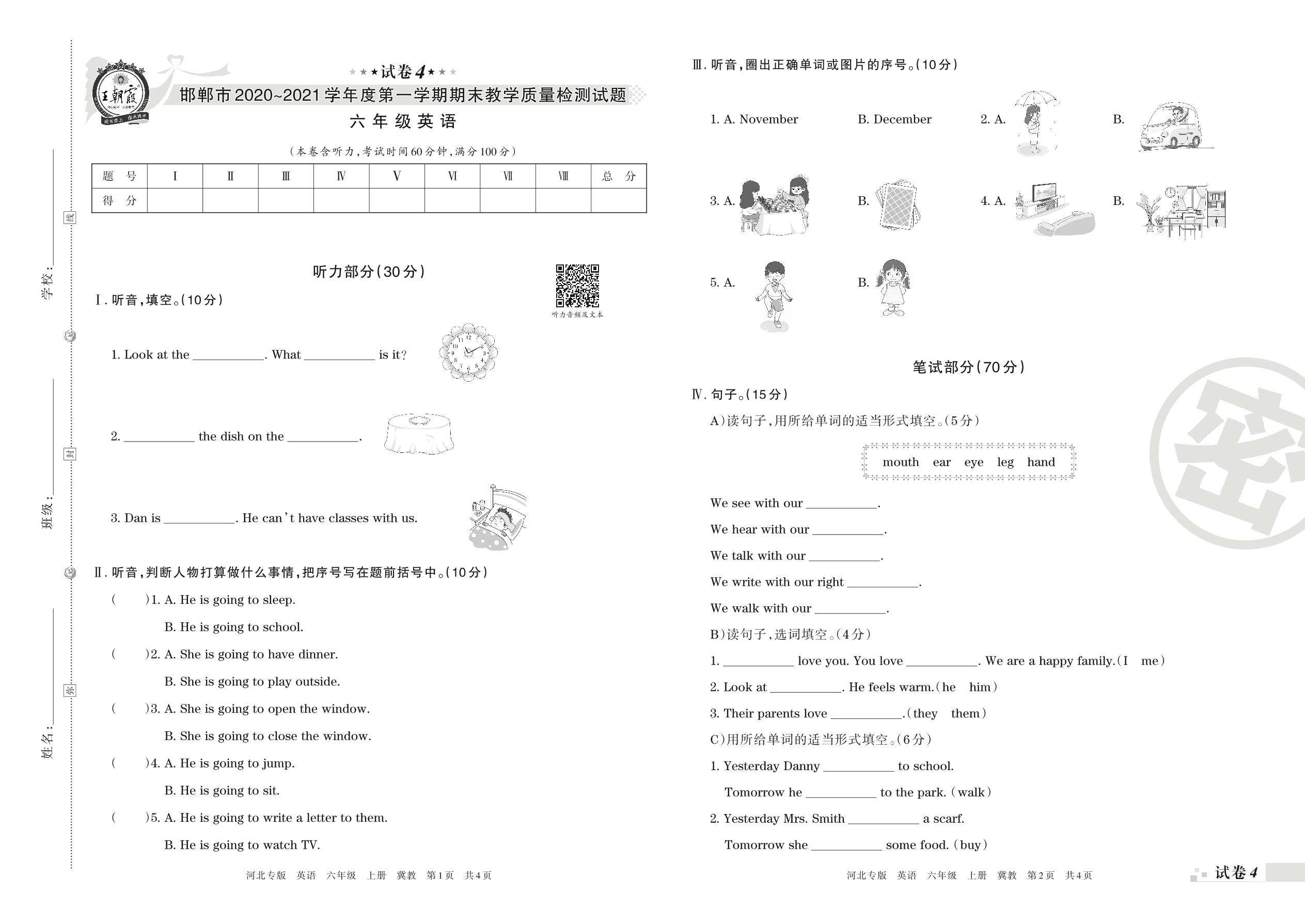 邯郸市2020~2021学年度第一学期期末教学质量检测试题六年级英语(冀教版)【4】