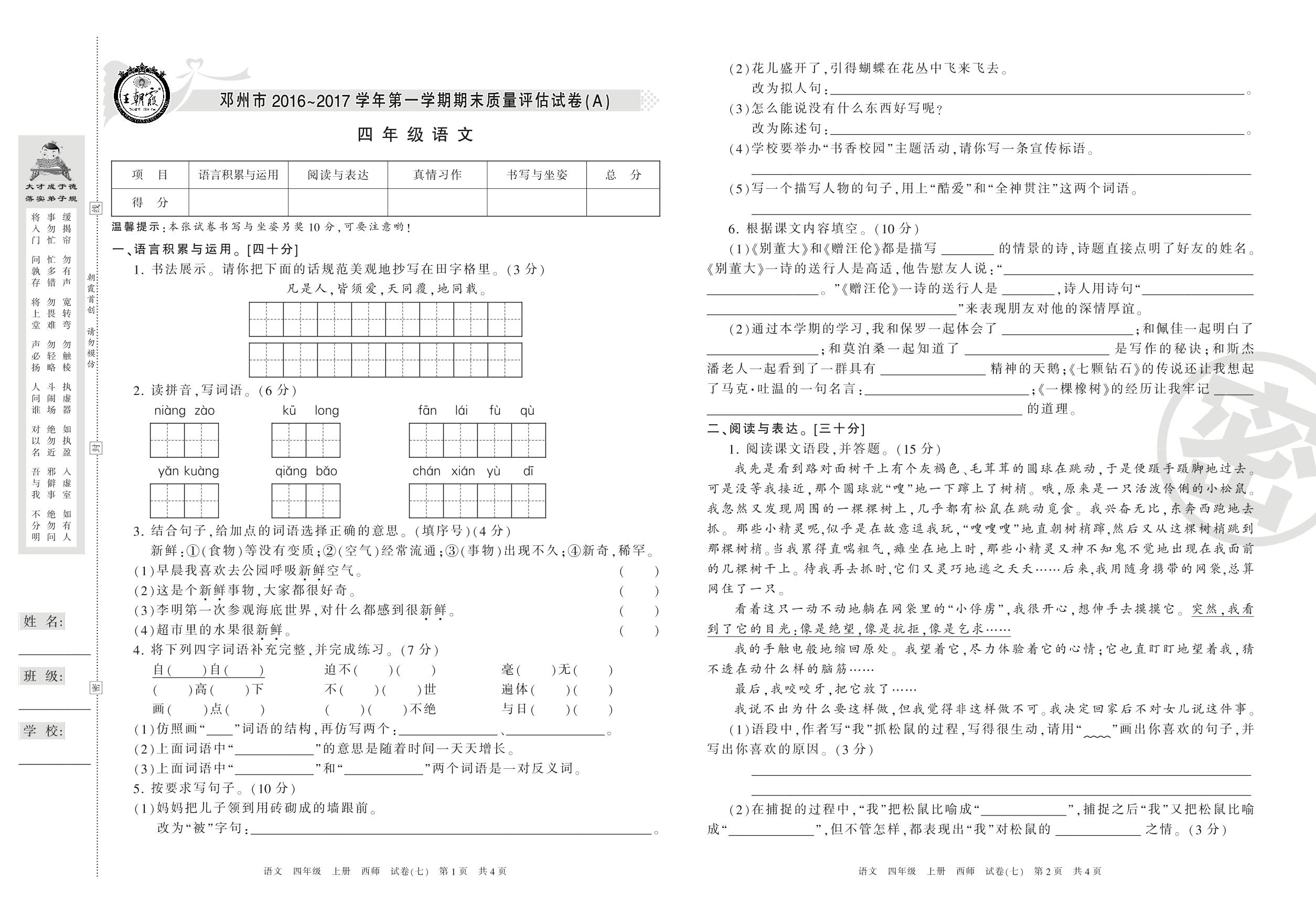 2016-2017学年第一学期邓州市四年级语文试卷(西师版)【7】