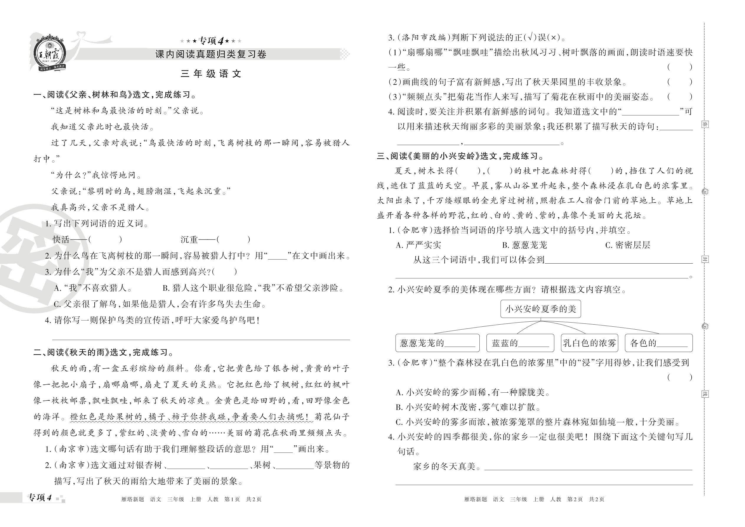 王朝霞期末专项卷——课内阅读真题归类复习卷三年级上册语文(人教版)_R211223135826781【4】