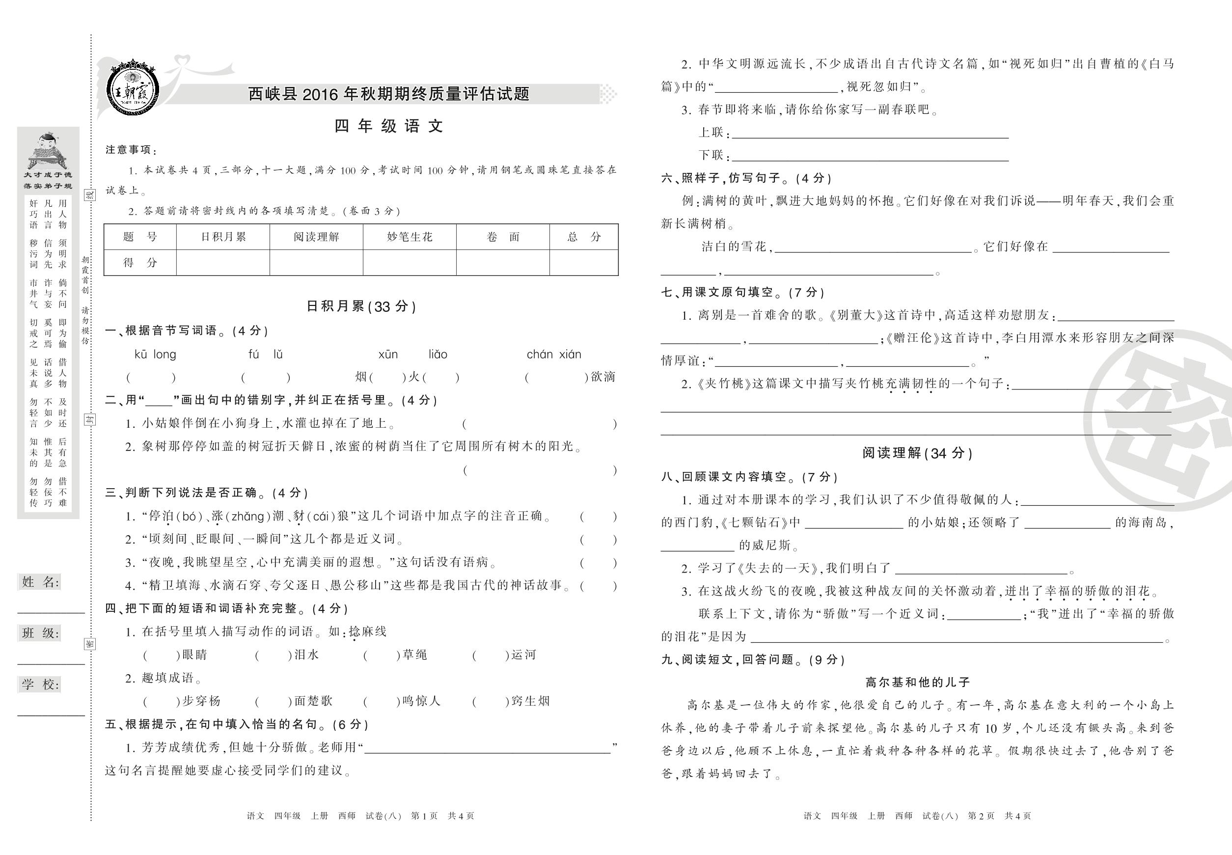2016-2017学年第一学期南阳市西峡县四年级语文试卷(西师版)【8】