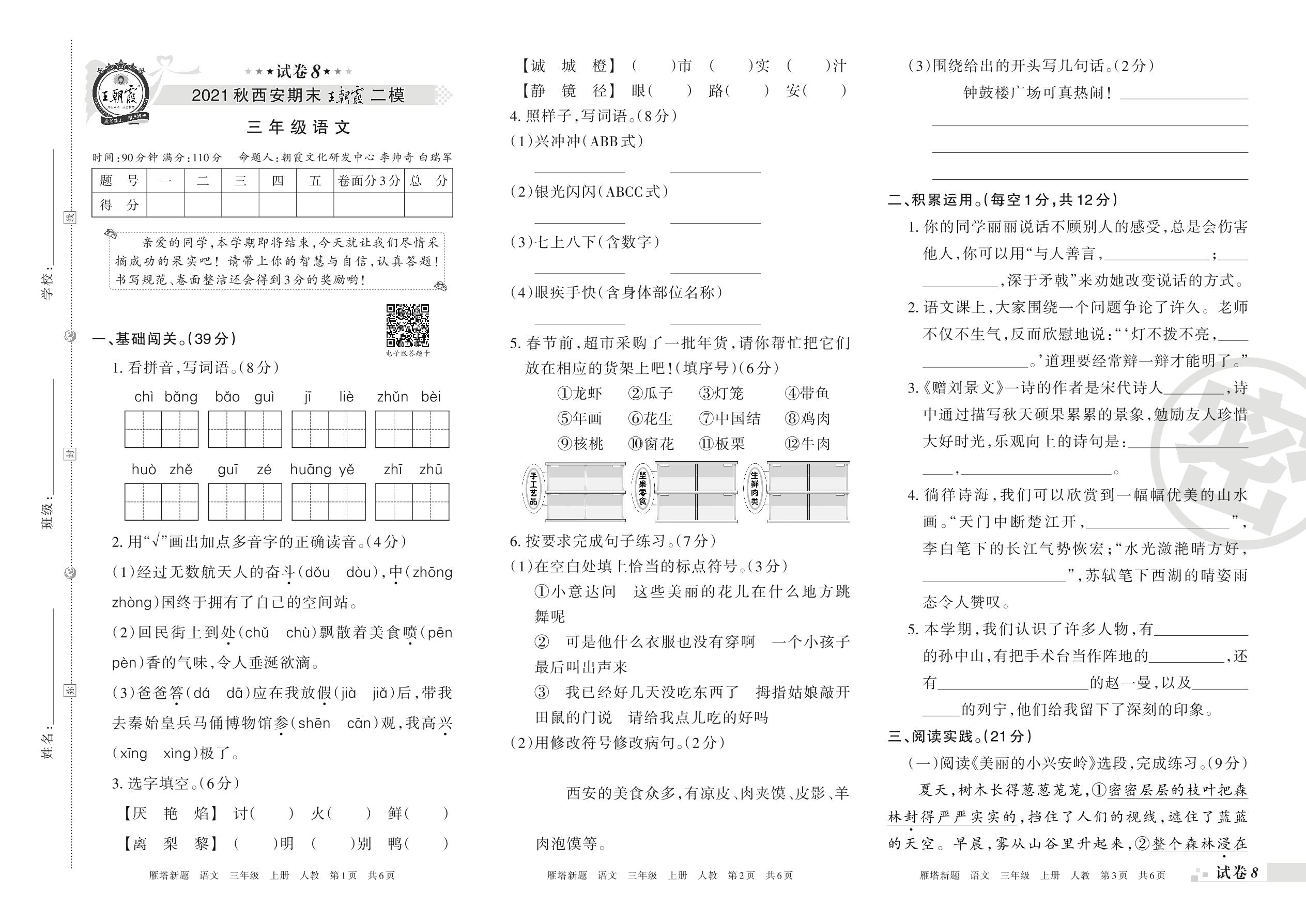 王朝霞期末模拟卷三年级上册语文(人教版)_R211223135827031【8】