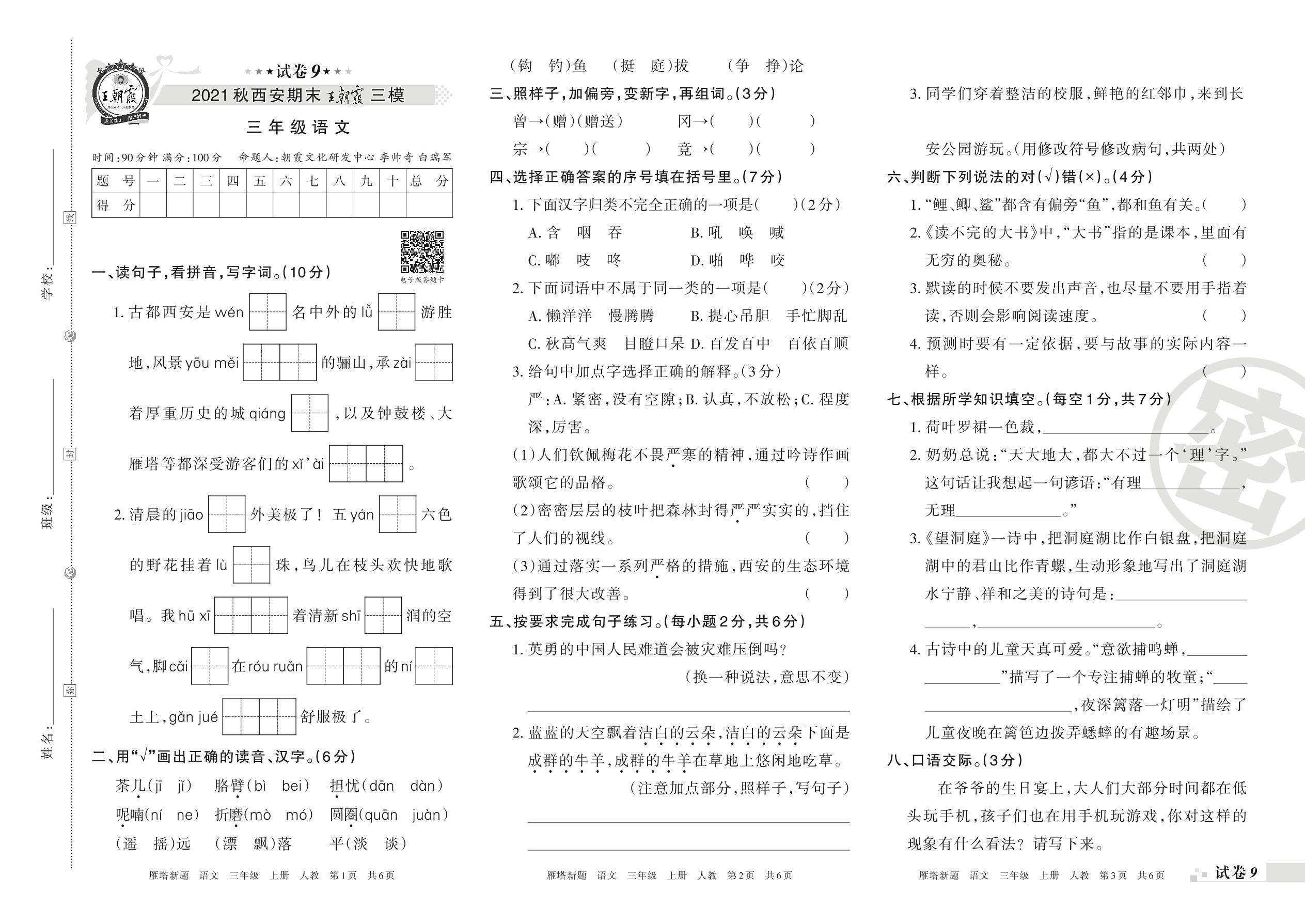王朝霞期末模拟卷三年级上册语文(人教版)_R211223135827406【9】