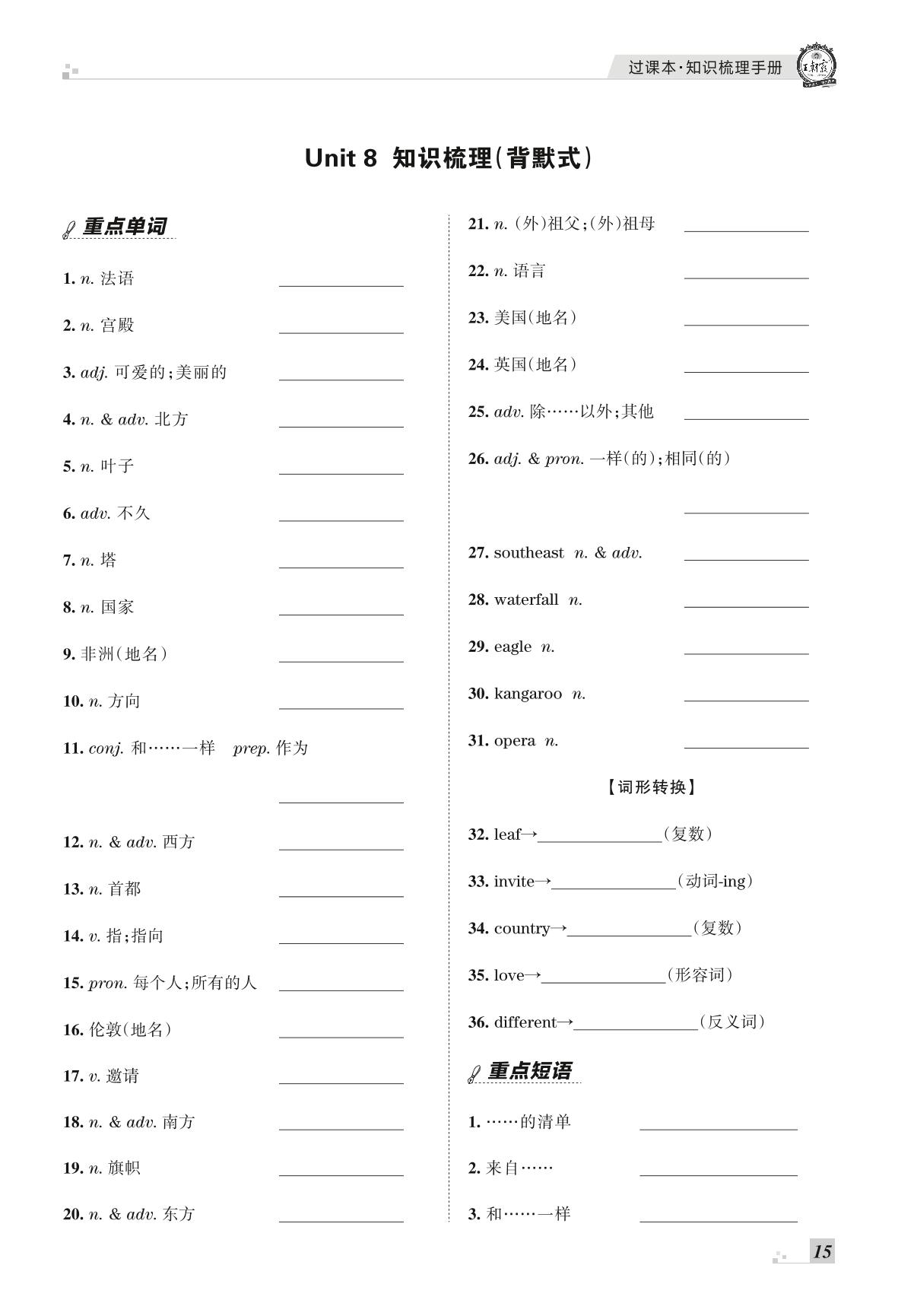 王朝霞期末过课本——Unit 8 知识梳理(背默式)七年级上册英语(冀教版)【8】