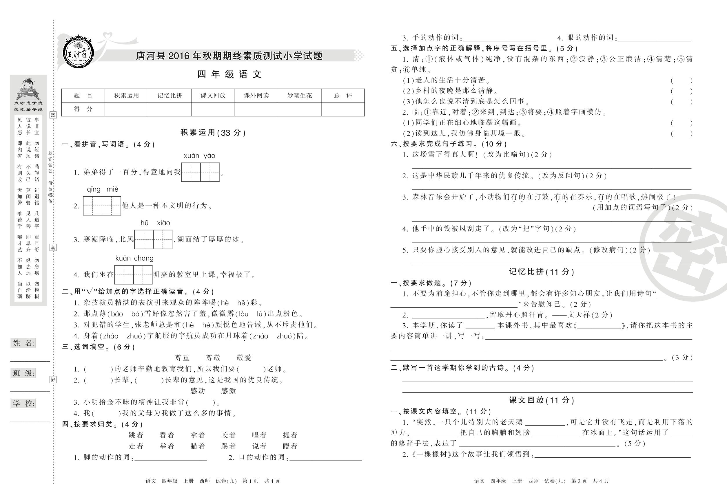 2016-2017学年第一学期南阳市唐河县四年级语文试卷(西师版)【9】