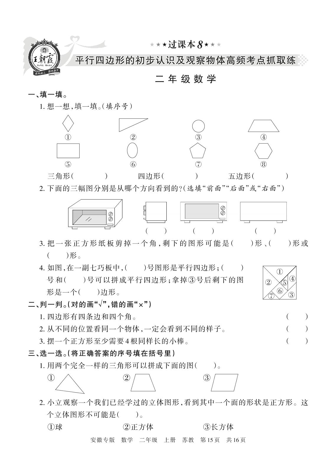 王朝霞期末过课本——平行四边形的初步认识及观察物体高频考点抓取练二年级上册数学(苏教版)【8】